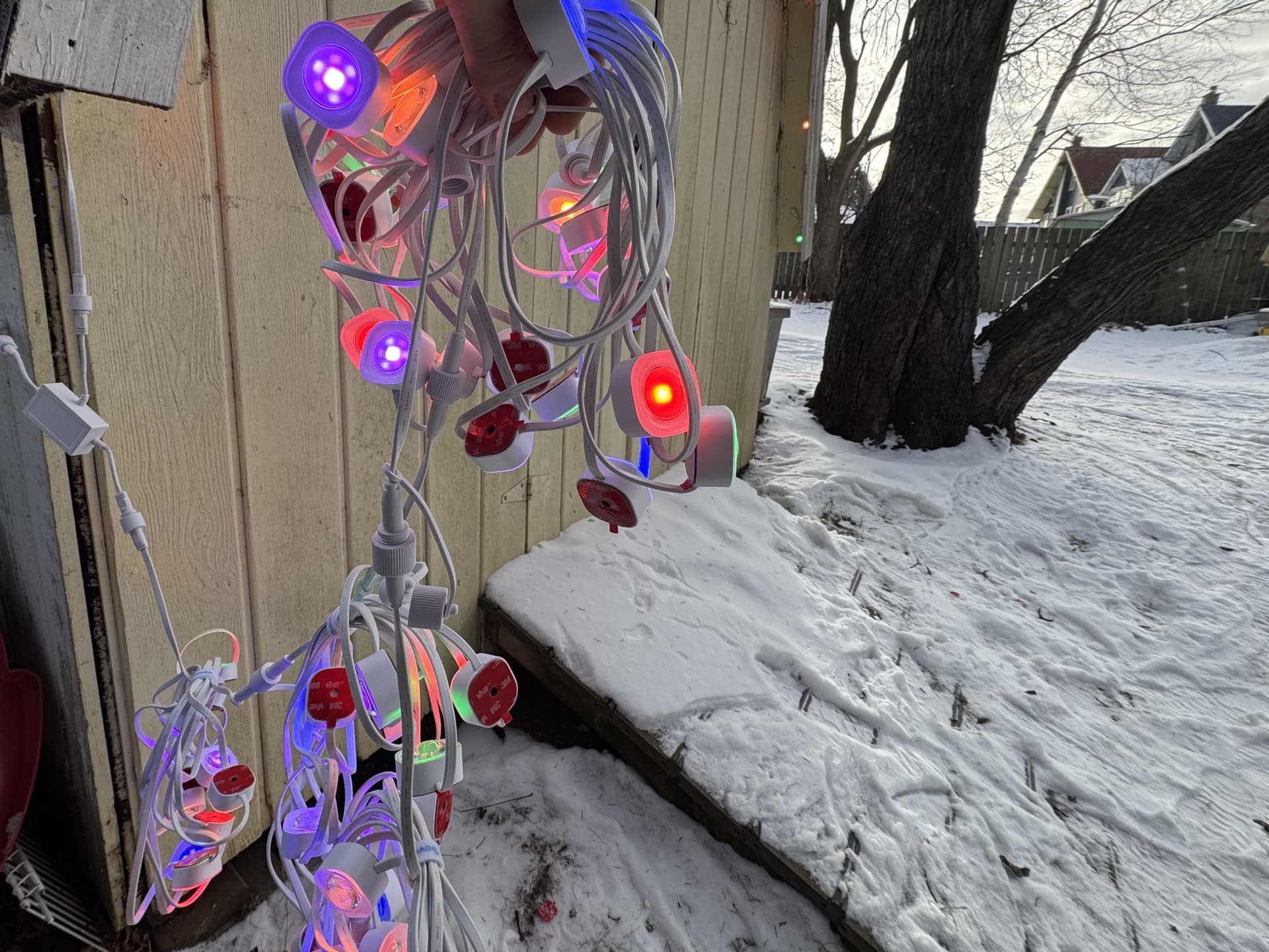 The Govee Pro lights though are 36 volts, so you need a 36 volt power supply connected to the power (red) and ground (blue) of the Govee lights. You could power that same controller linked above via a USB-C charger with just the signal wire "D" from the ESP32 connected to the yellow Govee data wire. I've got some waterproof boxes and standoffs to mount up the bits, for a fairly refined end result that is usable outdoors.