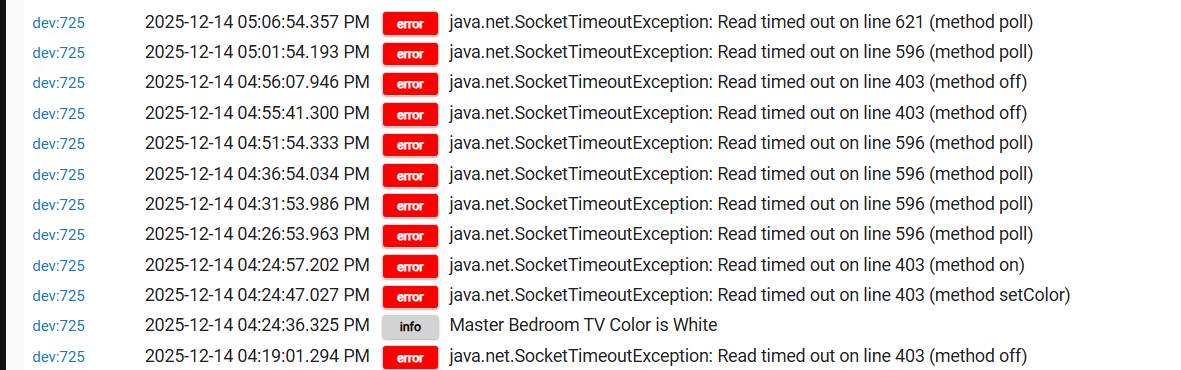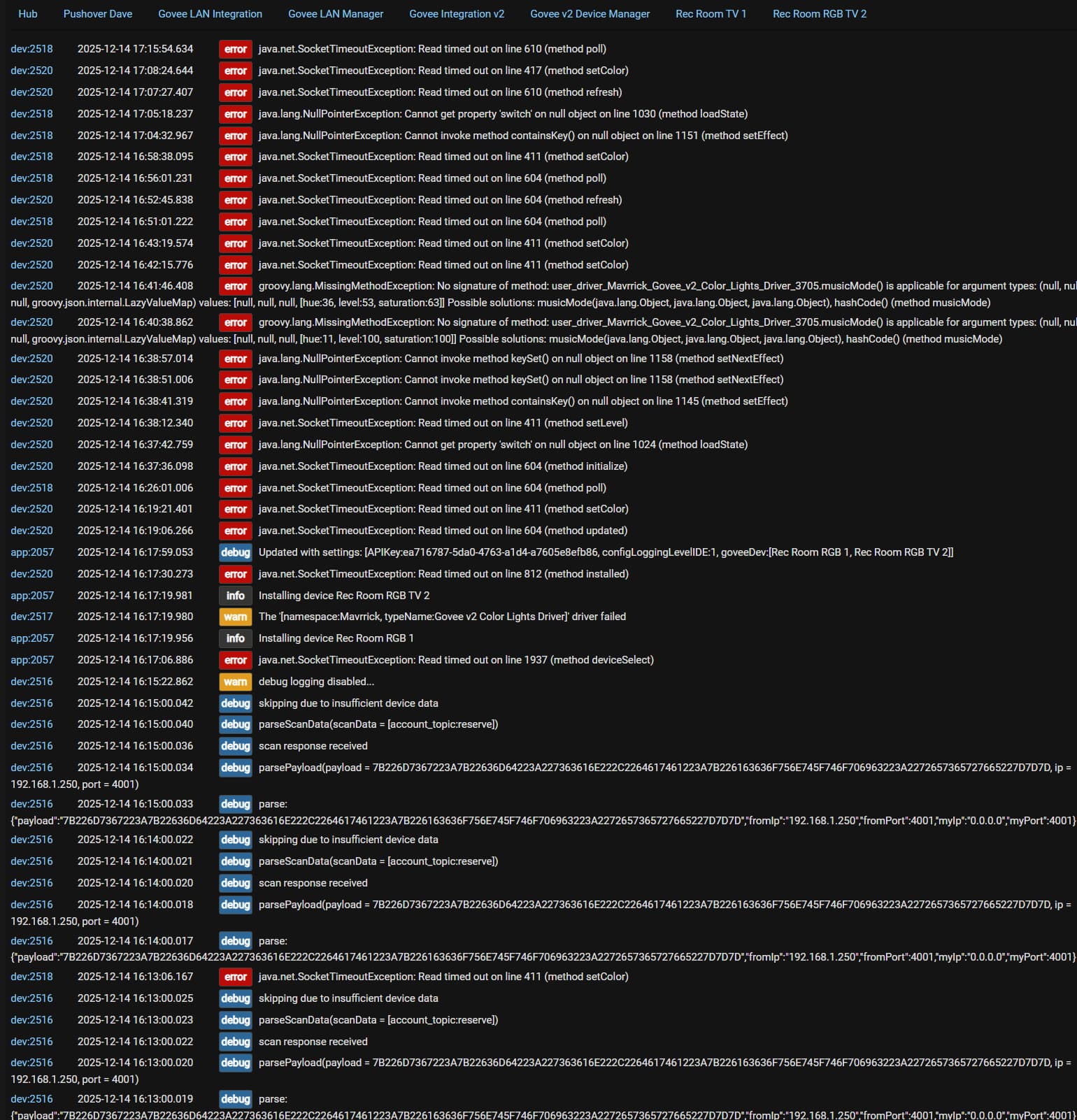 For some reason I noticed all my Govee lights are really slow. Ex I have Govee RGB strip light come on when motion is detected. Before there was a 1 or 2 second delay. But now it’s like a 30 second delay. Just started happening a day or two ago. I’m also seeing a lot of errors in the logs. I didn’t change anything, did a hub reboot some thing. I do have 14 Govee light strips. Maybe I should make some of these lights lan only maybe it will take off the load.