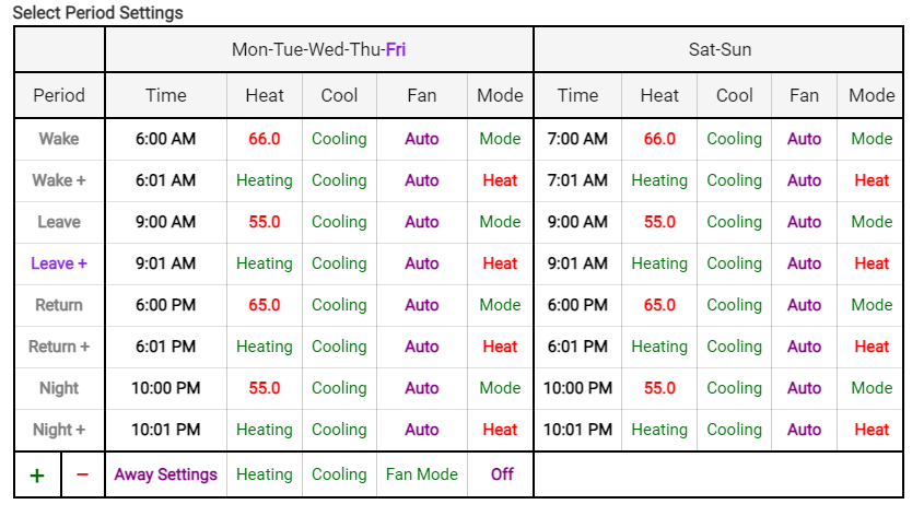 But, I wonder if my adjusting the time periods table such that the temp and the mode change don't occur at the same time (which has been working) puts me in a position where at 5:51PM (in the Leave + period) I am in a time period wherein the Thermostat Scheduler has no target Heat setting?