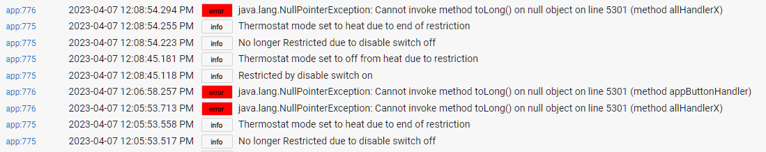 More recently (with 2.3.5.123), this doesn't seem to work. I'm not a coder, but wonder if this error which occurs when I turn the Furnace disabled virtual switch off provides any guidance as to what is no longer working as it did before?