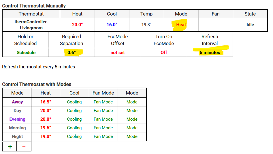 If anyone is using a similar setup to me (thermostat scheduler/controller) i can use some help in all the variables, i.e. hysteresis, control Offset, Thermostat mode, Required separation, Refresh interval... Most of those i got by trial and error, so i would love to get a more concise and practical knowledge on.