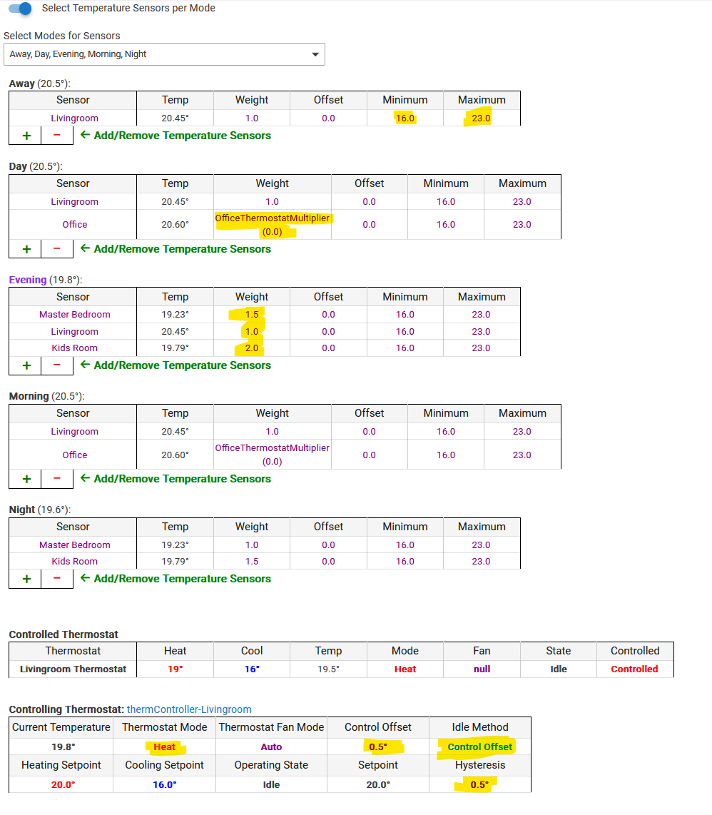 using the thermostat controller to set up per mode which room thermostatstemperature sensors are read and averaged/weighted