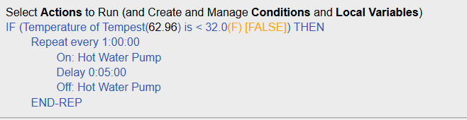 Thanks!!! I will have a virtual switch that will turn the rule on and off. We don't get freezes a lot but I just installed a hot water heater recirculating pump to help with instant hot water at some locations in my house. We have a sink on an outside wall that will freeze up during a hard freeze and I think this will solve that problem.