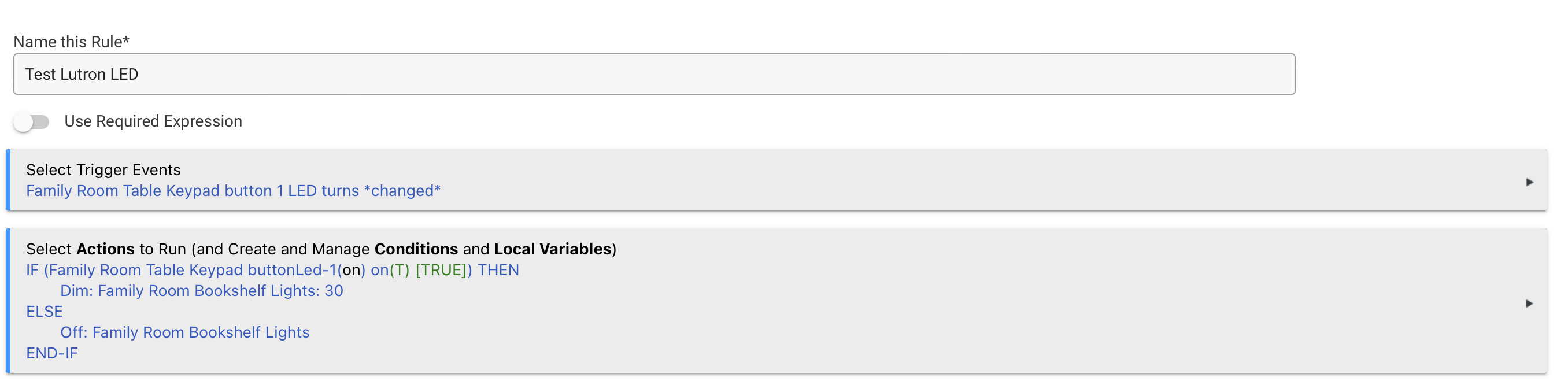 Other possibly relevant thoughts: my Lutron keypad for some reason only reports button 'release' over the Telnet. Presses aren't reported. Also, since the the button is programed by the Lutron software, doubletap/hold functions of the Hubitat driver aren't available.