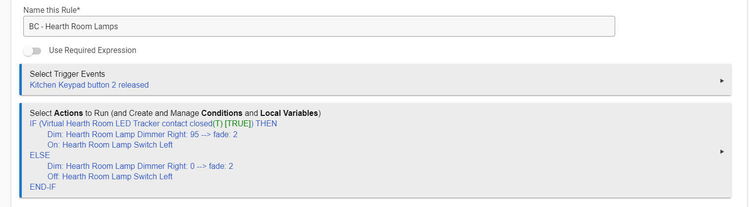 I have a feeling that the answer may be found in room lighting rather than in Button Controller/RM, but I actually haven't played with room lighting yet. If what I'm trying to do can be found there, you don't have to lay it all out for me, I can go do the research on it.