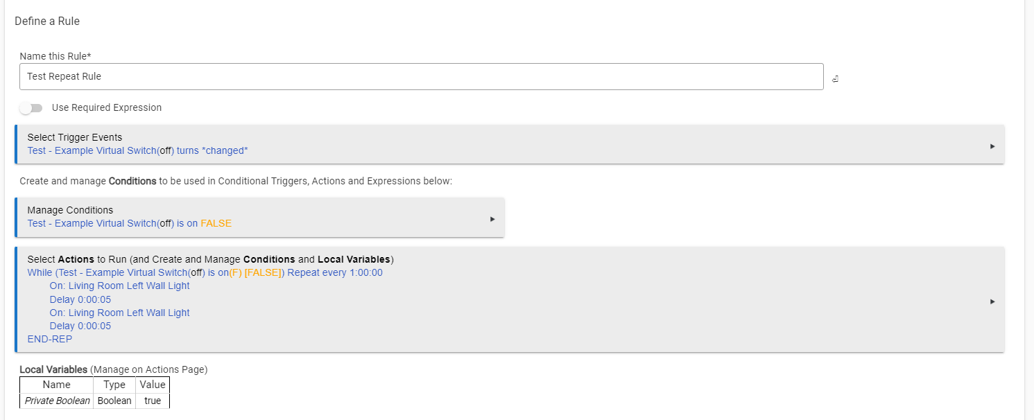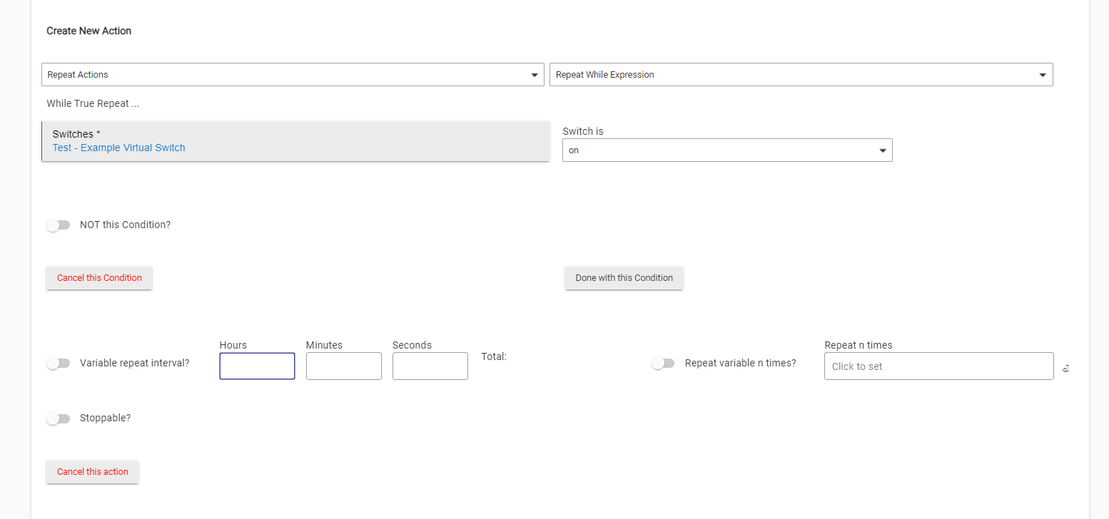 I have had a number of scenarios that involve me needing to create repeating actions in Rule Machine which are started and stopped with the on/off of a switch.