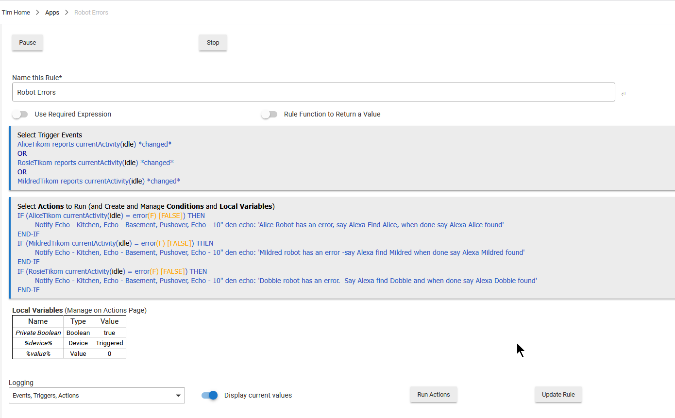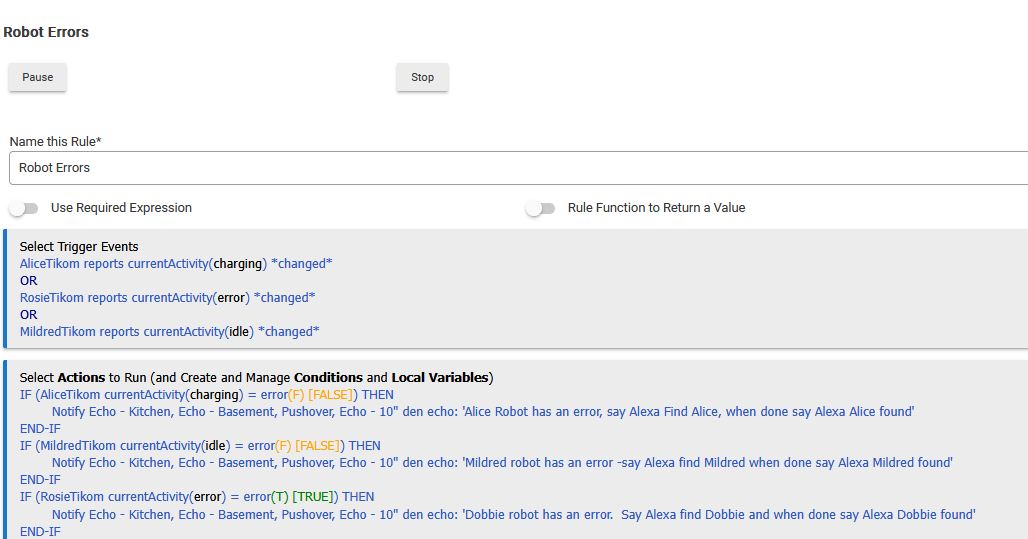 Also, you probably want these as three separate rules, unless you don't mind multiple notifications for the same device (all devices are going to be checked for a value of "error" any time the value for any device changes -- even if that device changing to "error" wasn't what triggered the rule, and even if you already got a notification for that device, for example). If you only care about notifications, a trigger on "error" instead of "*changed*" and no IF THENs necessary in your actions would be a very simple rule -- or set of rules, one for each device -- to write that sounds like a closer match for what you actually want.