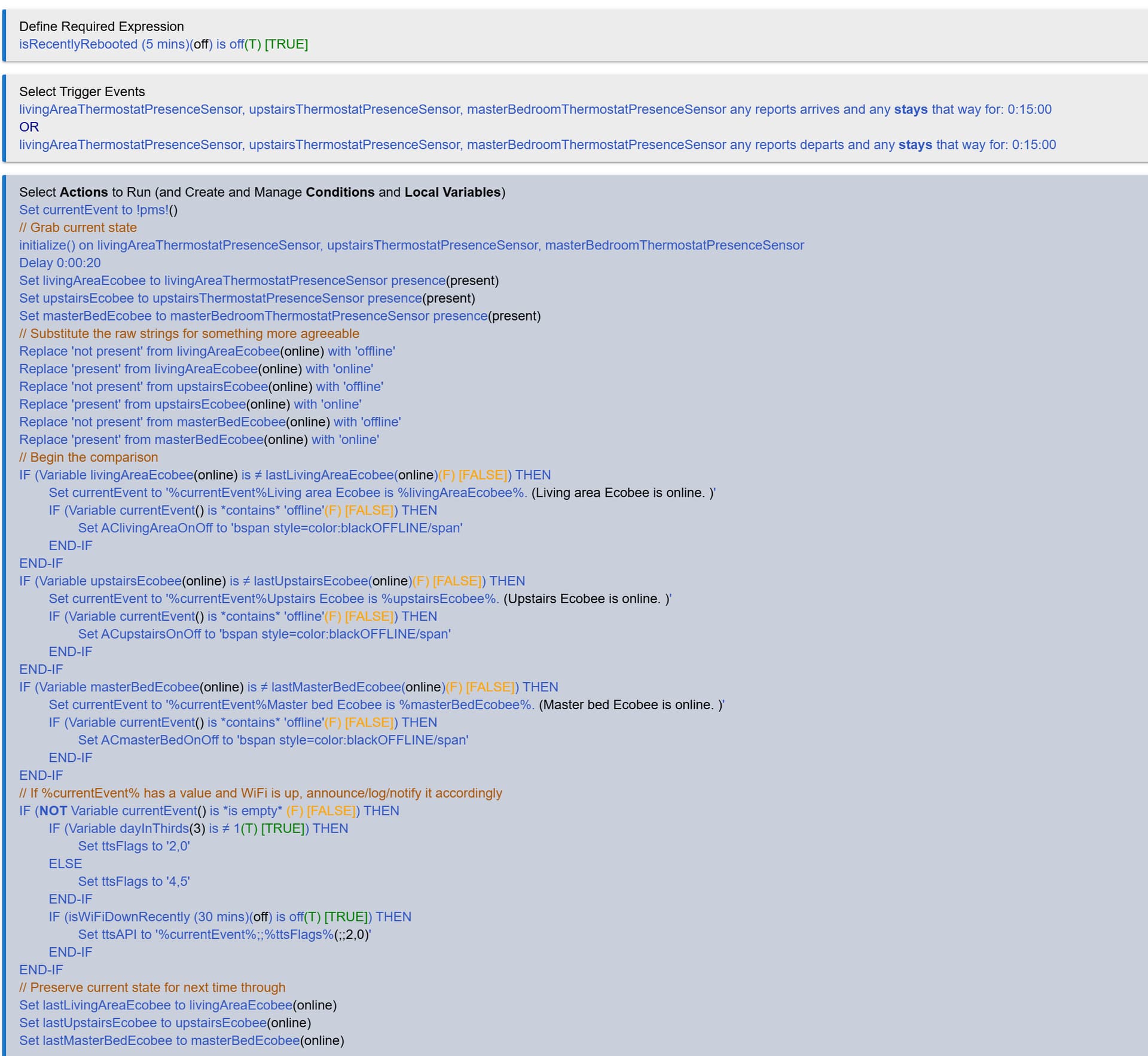 Then create a RM rule that is triggered when the device reports 'departs' (and in my case, also 'arrives' or returns). The following is an albeit complex example, but it contains the necessary rule structure in the trigger, conditional logic, and possible actions.