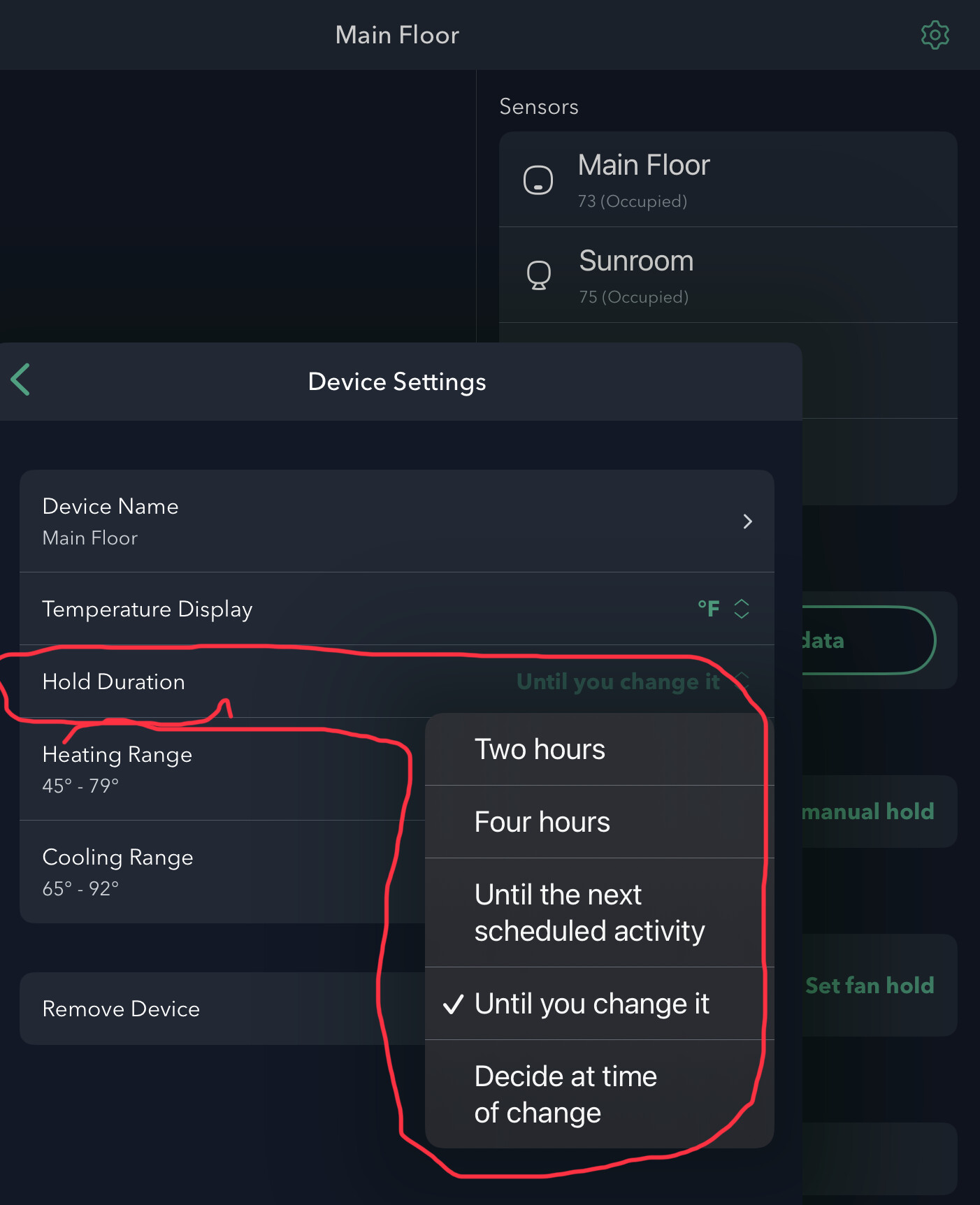 It’s 4pm and the device has 2:31 left on a manual 4 hour hold of 78°-65°.