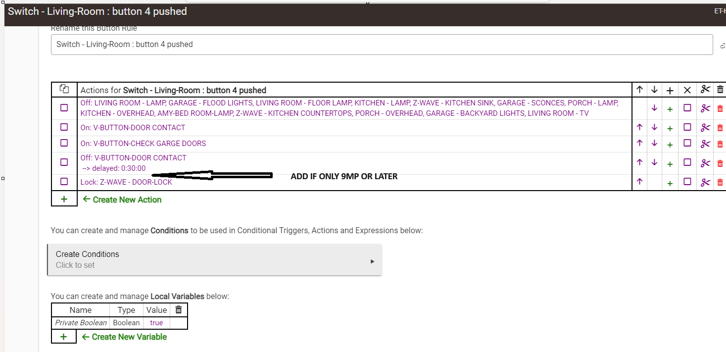 IF (Time between 9:00 PM and 11:59 PM FALSE) On: V-BUTTON-LOCK-DOOR