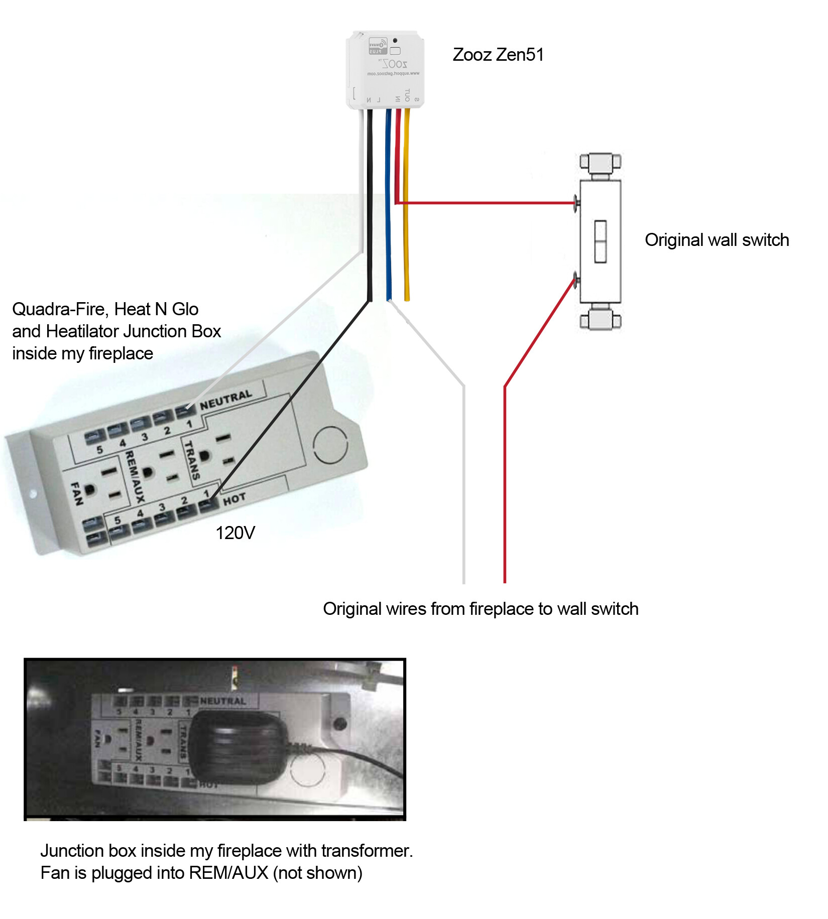Here is my plan. I realize that the wall switch will not be synchronized with the ON/OFF of the smart switch (Zen51). But this design allows me to turn off the fireplace when not in use or if there is a problem with the smart switch. One problem with this design is that I cannot MANUALLY turn on the fireplace, overriding the smart switch. Maybe there is a better solution to allow that.