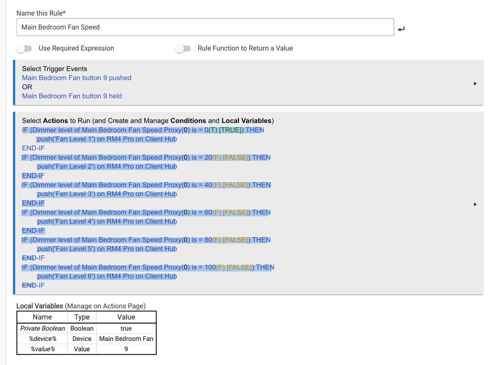 IF (Dimmer level of Main Bedroom Fan Speed Proxy(0) is = 80(F) [FALSE]) THEN