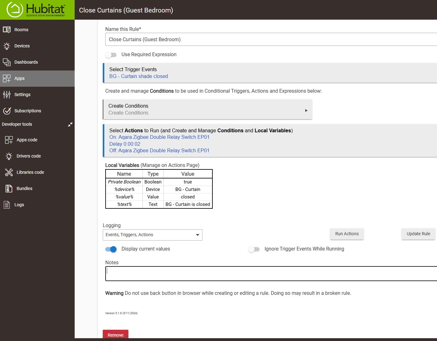 I have another event linked to the same virtual shade for OPEN, only the zigbee device for that is different as its the second relay connected to the curtain open signal wires. As both rules are linked to the same virtual shade when the shade on the dashboard is changed from open to close it will trigger each event,