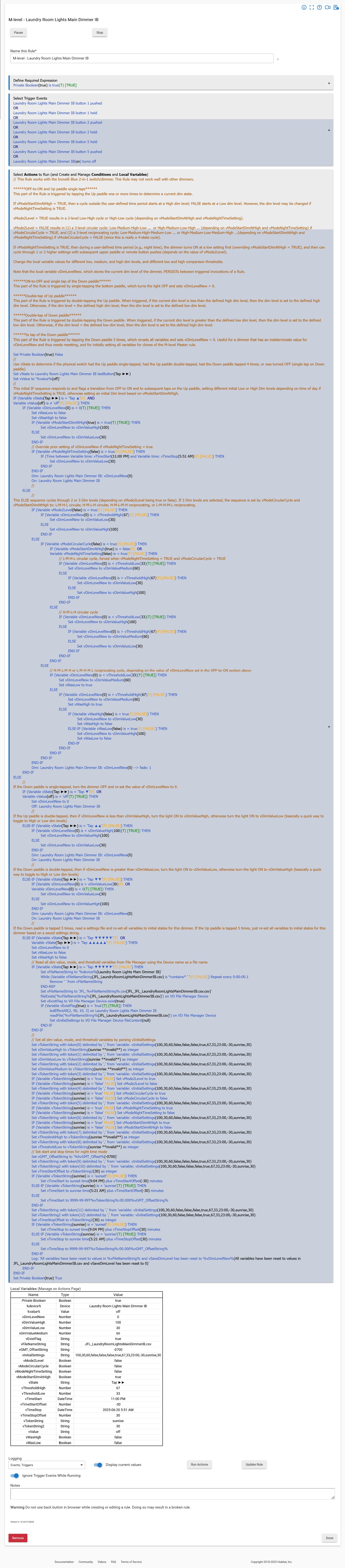 Understood, but my actual rule (of which I have 30 instances) requires knowledge of previous states when a switch paddle is pressed. Rather than use hub variables and MANY more rules per light switch (which was my ver. 1.0 approach), for sake of my sanity in keeping track of (and replicating) rules, I put everything for each dimmer unit into one associated rule, hence the need to distinguish UP taps from BOTTOM taps (which is NOT straightforward with Inovelli Blue dimmers). Button Controller also doesn't quite work without passing a bunch of hub variables around to track state.