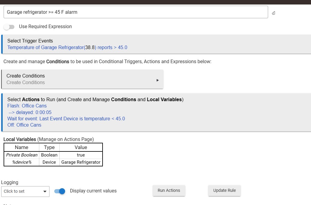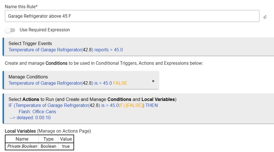 Action: IF (Temperature of Garage Refrigerator(38.3) is > 45.0(F) [FALSE]) THEN (skipping)