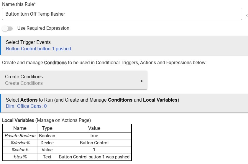 Now I'm trying to figure out how to create a button that will STOP the rule from running when the temp goes over for a long time. The button rule I now have does stop the lights from flashing for a bit of time but then starts again.