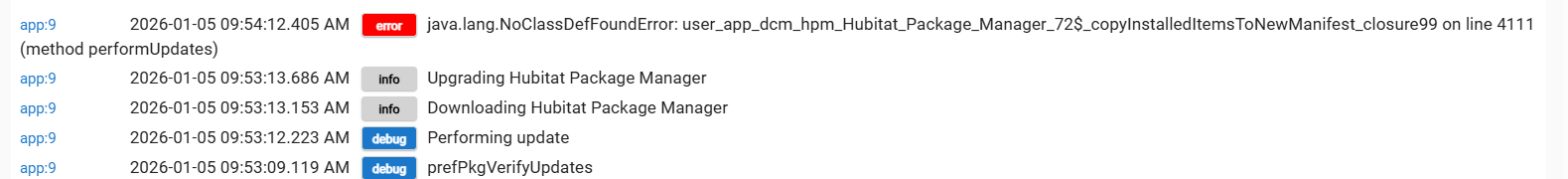 This appears to be normal behavior. I have also observed this now with HPM 1.9.4 on a different hub with a clean install.