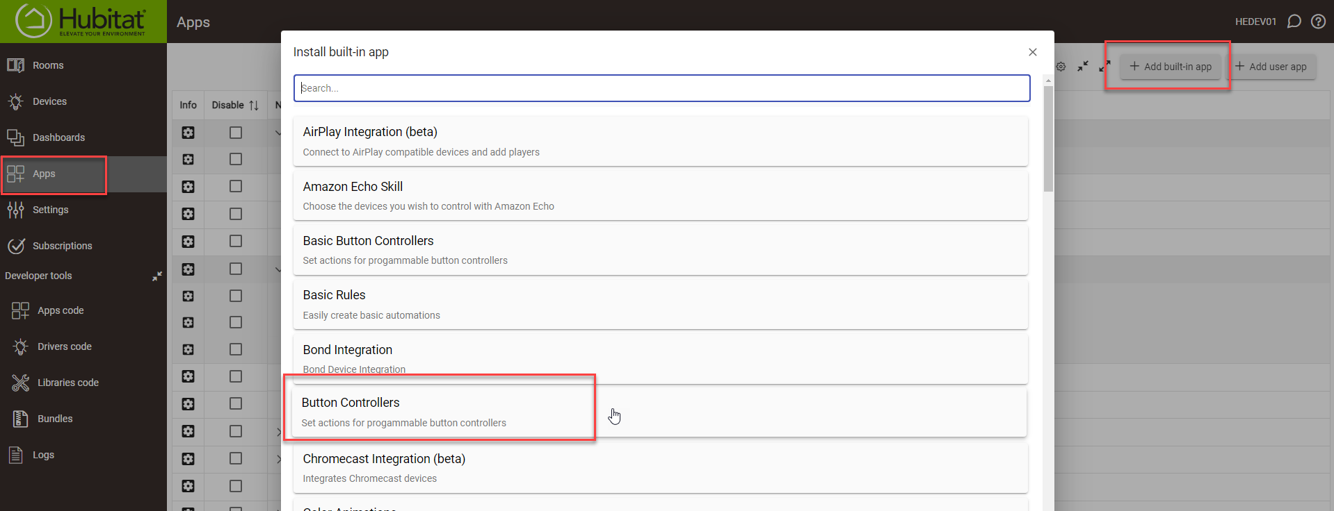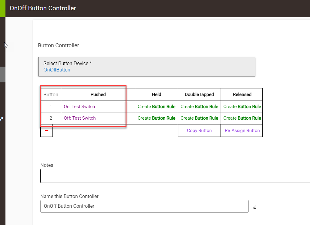 Create a new Button Controller, selecting the new Virtual Button created earlier. Create two "rules" for each of the two buttons, using a Control Switches action, button one push for ON and button two push for OFF.