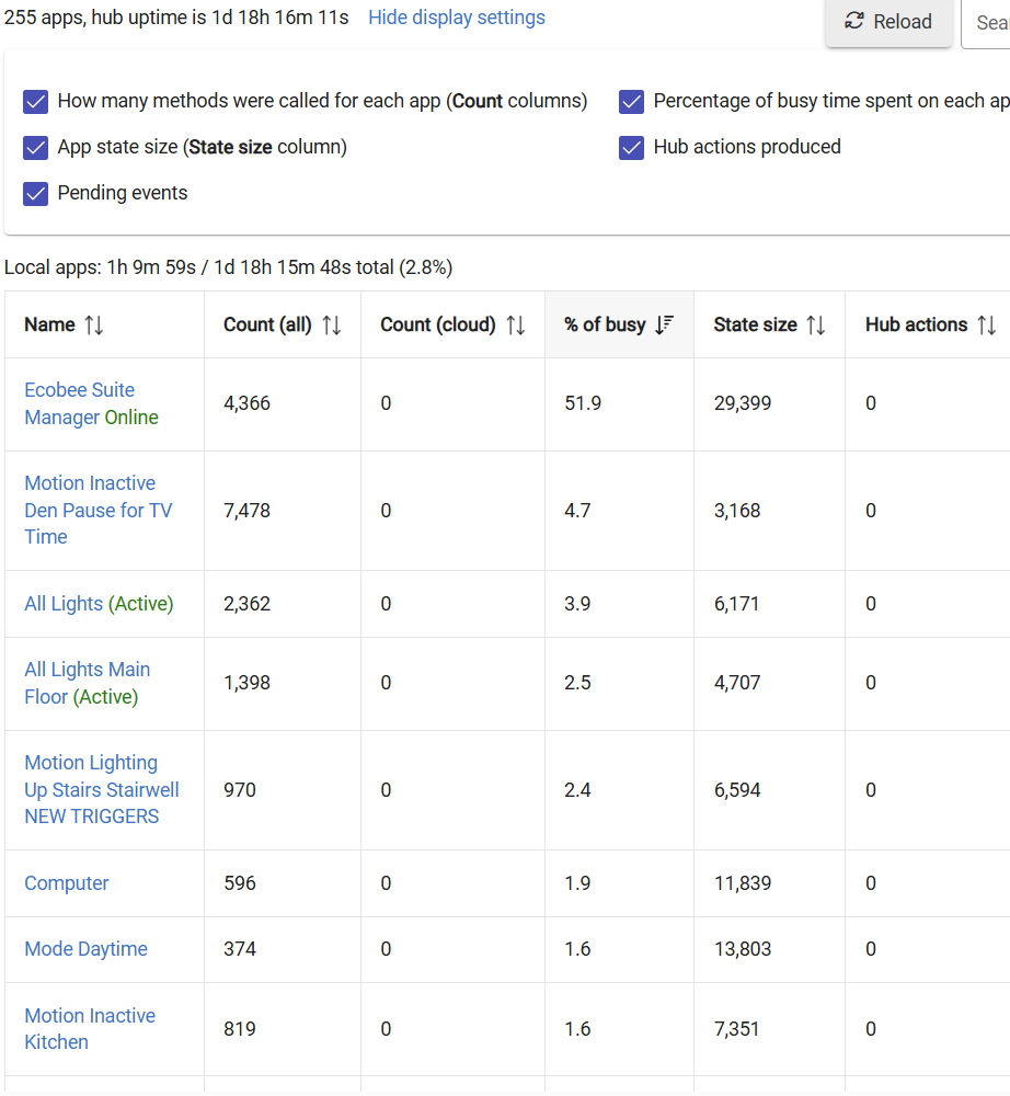 The stats you are showing above don't really point to anything particular. It can be deciving to see ecobee suite at the top of the list with 51% of busy. The reason that is insignificant is that the line right above that table shows the total busy for local apps is 2.8%. So 1.4% for ecobee suite is not much. If you have the ecobee suite polling interval set to 1 min it is probably fine.
