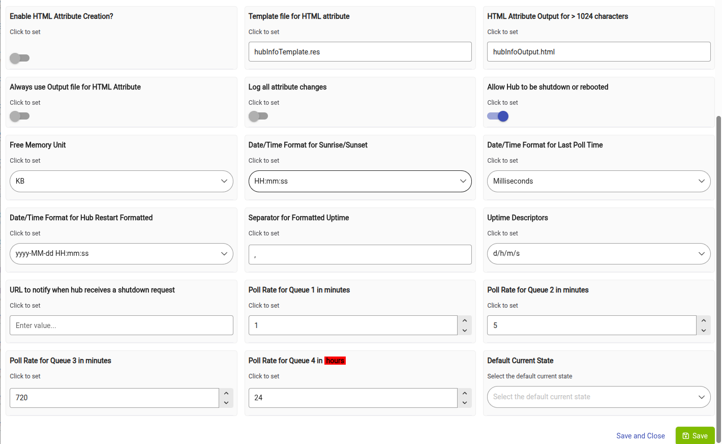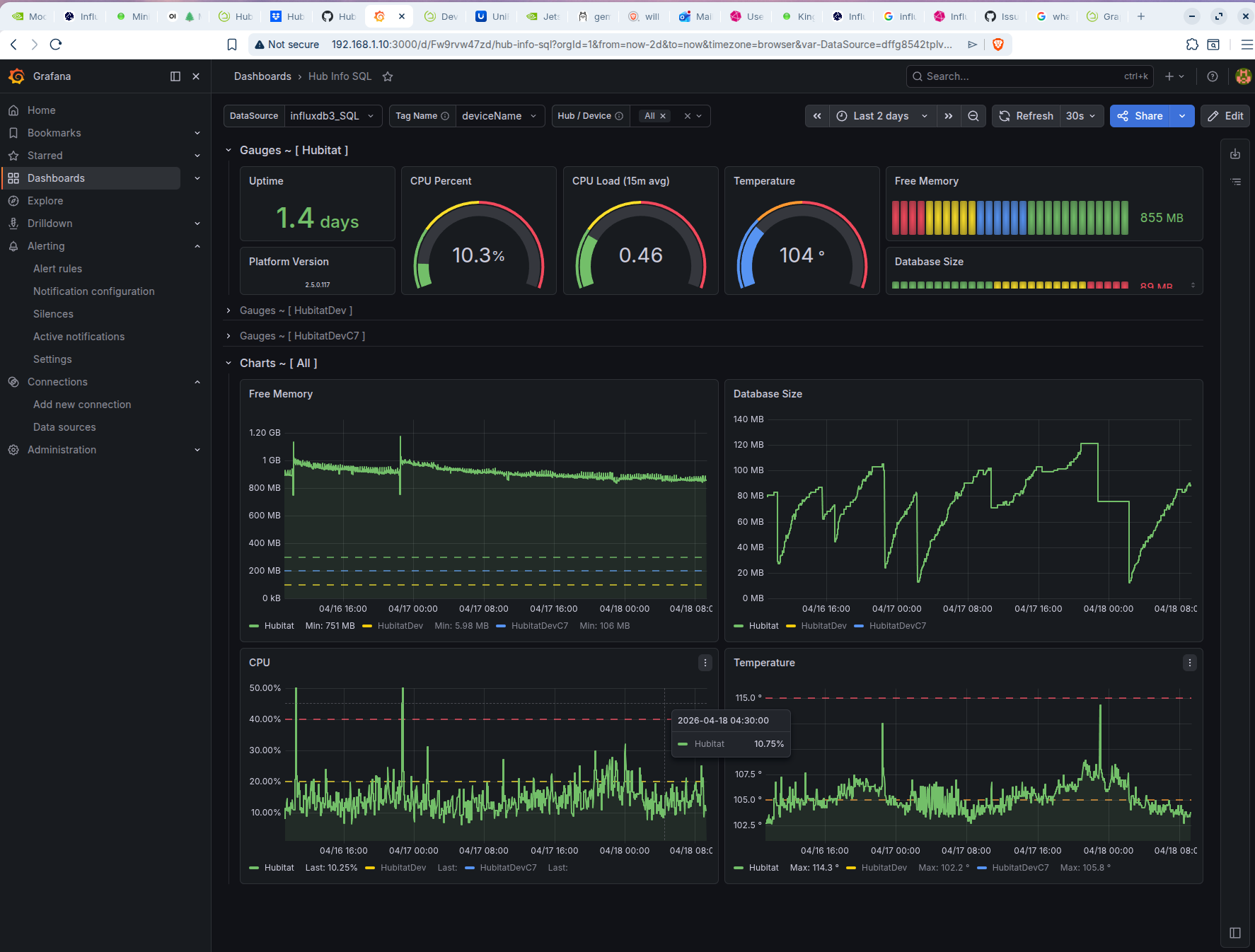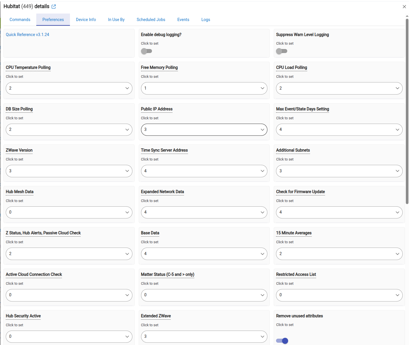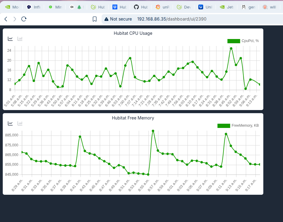 It is a driver not a app. Go into the devices page and click on the option to install a virtual device. Then when selecting the driver for it to be use the Hubinfo Driver. The driver acts as a central point to retrieve certain metrics of the system at a few different poll rates. Once it is installed go into the virtual device and access it's preferences tab. From their you will setup the preferences to determine when groups of metrics are collecting by selecting the Poll group they belong to. Then at the bottom you set the value for how often the Poll groups are collected. In this case the most important metrics are the memory, CPU, and DB Values. the rest don't exactly help us in this discussion. Memory can be collected fairly frequently. It doesn't do any good to collect the others any more frequently then 5 min general. At least for testing and validation i would set poll group 1 to 30 seconds and then poll group 2 to 5 min. Then only have memory in poll group 1. Then the CPU and DB metric groups to poll group 2. Here are my preferences settings as a point of reference. But this is based on my desire to collect them. If you don't need everything you can turn them off. I actually have some turned off myself