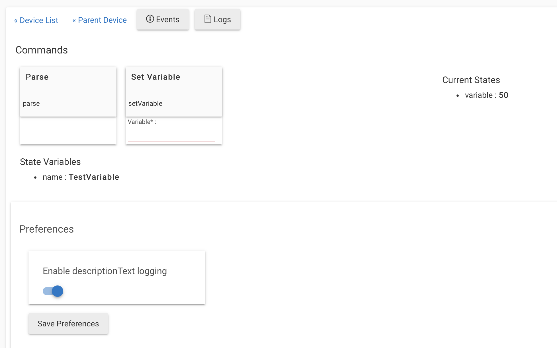 When the variable value is updated to 50 through the variable connector on a dashboard, the dashboard and the variable connector device show the updated value, however the variable itself still shows 1.