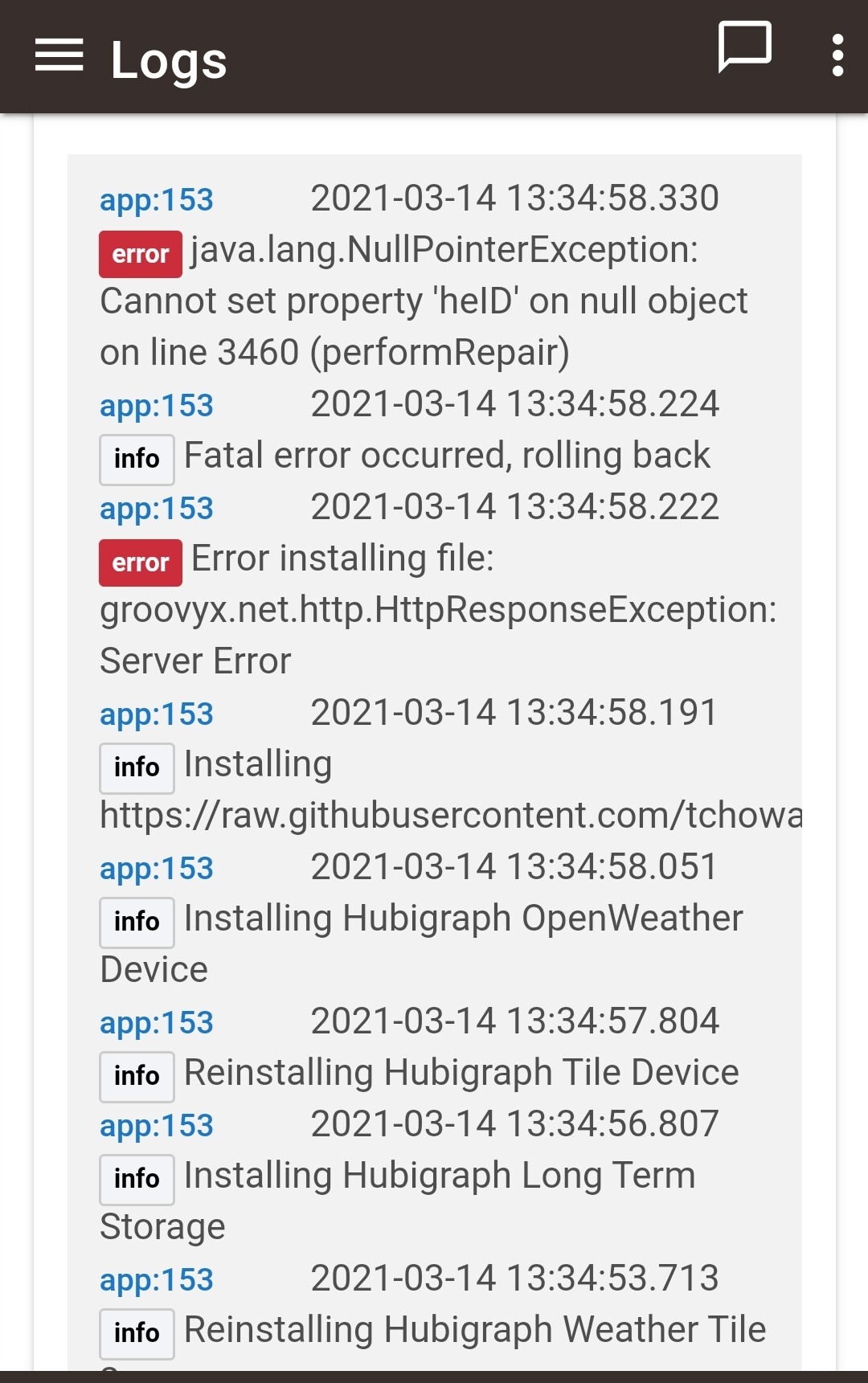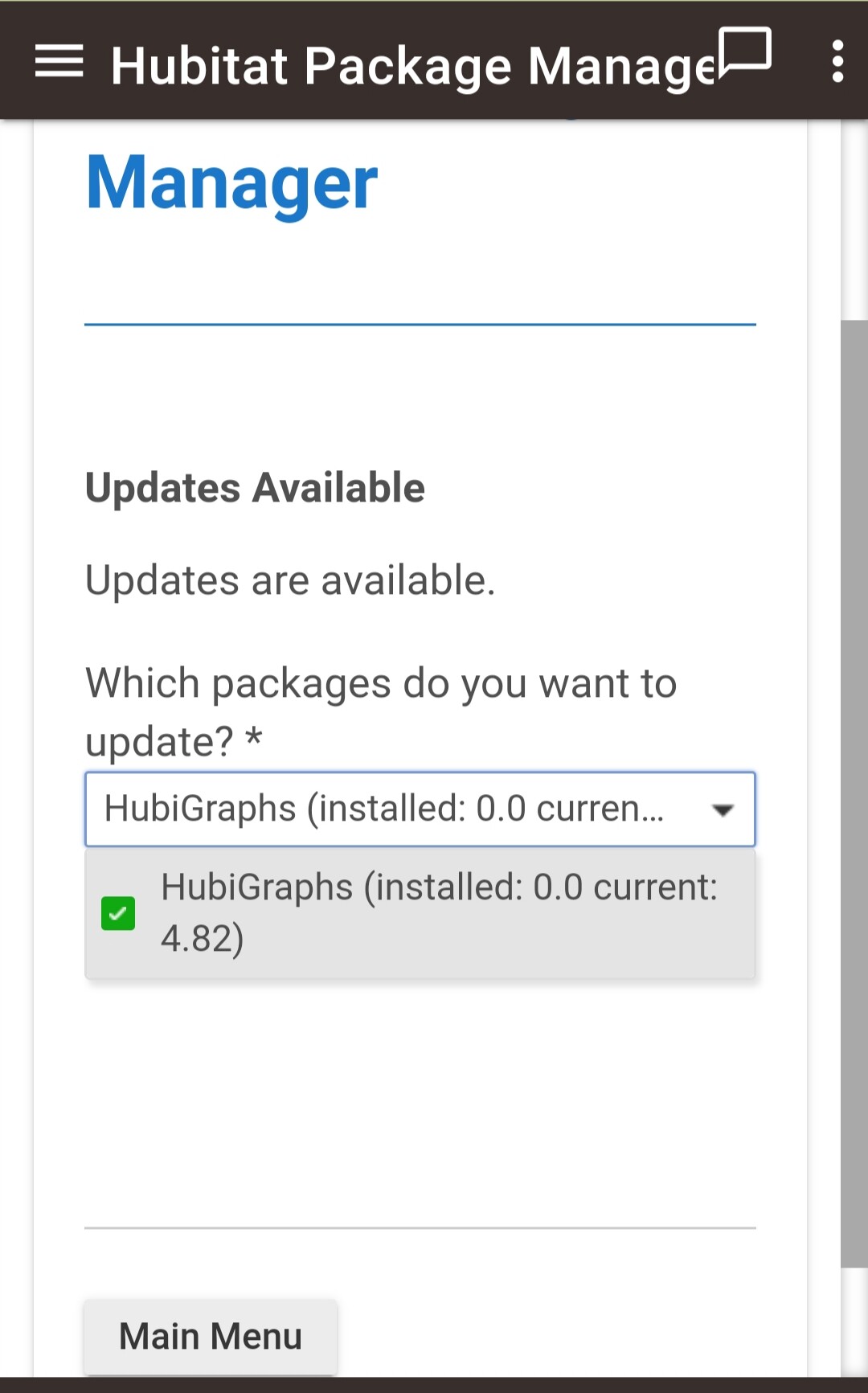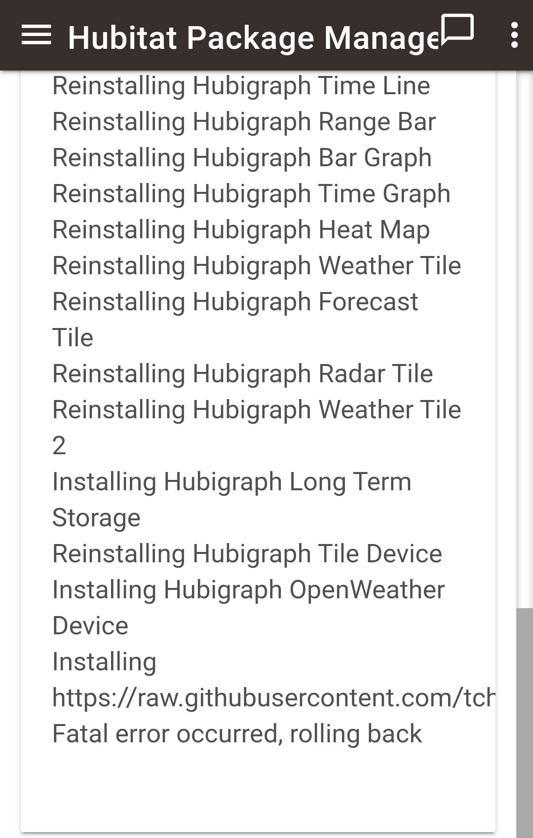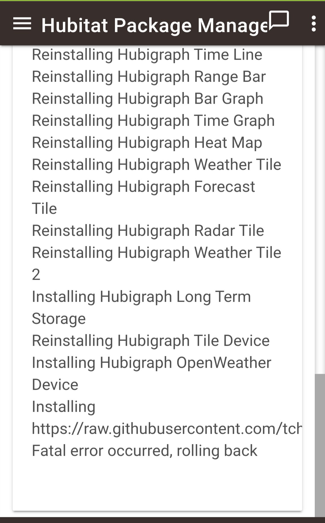 Have you tried manually updating the Hubigraph OpenWeather Device? From the above, thatâs the code that is failing to update - when Iâve gotten that message with my code itâs usually because I fat-fingered some code and HE is flagging it as invalid which will cause HPM to fail and rollback.