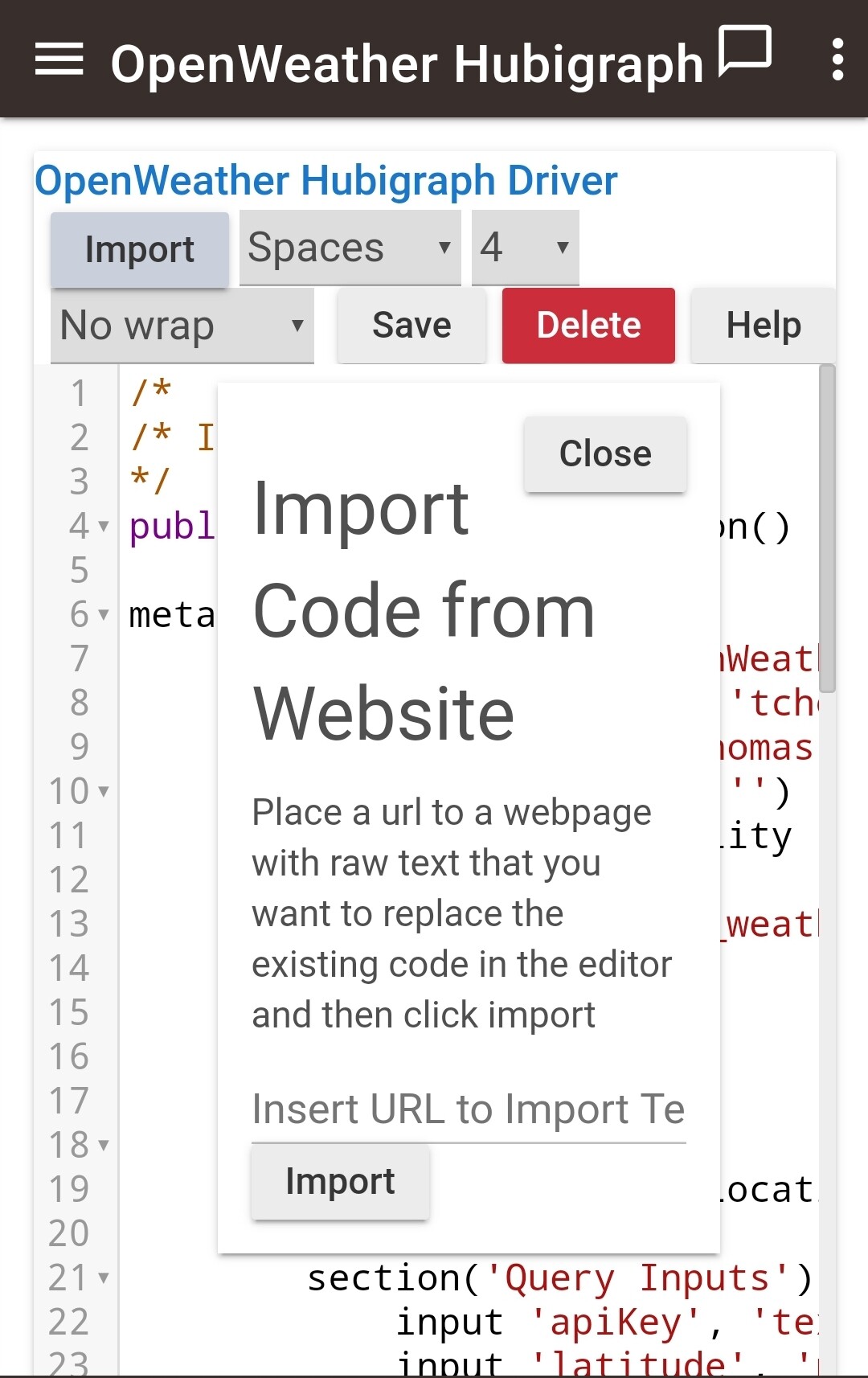 No worries. If you go to the Drivers Code tab, and open the Hubigraph OpenWeather Device, there should be a button at the top that says Import. If you push that, and the driver has the importUrl defined, youâll get a dialog box with the URL filled in and another Import button - pushing that one will pull the latest code. Say yes to the ovewrite message, and then click save.