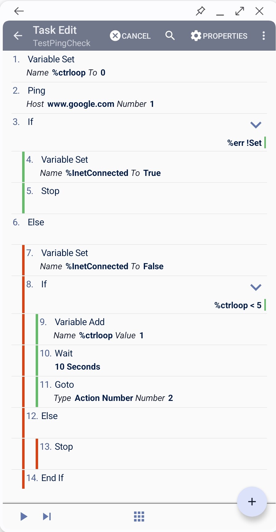 Create a Ping Test Task that stores the result in a variable. I have mine set to try 5 times at 10 second intervals before giving up. That is what the ctrloop variable is about.