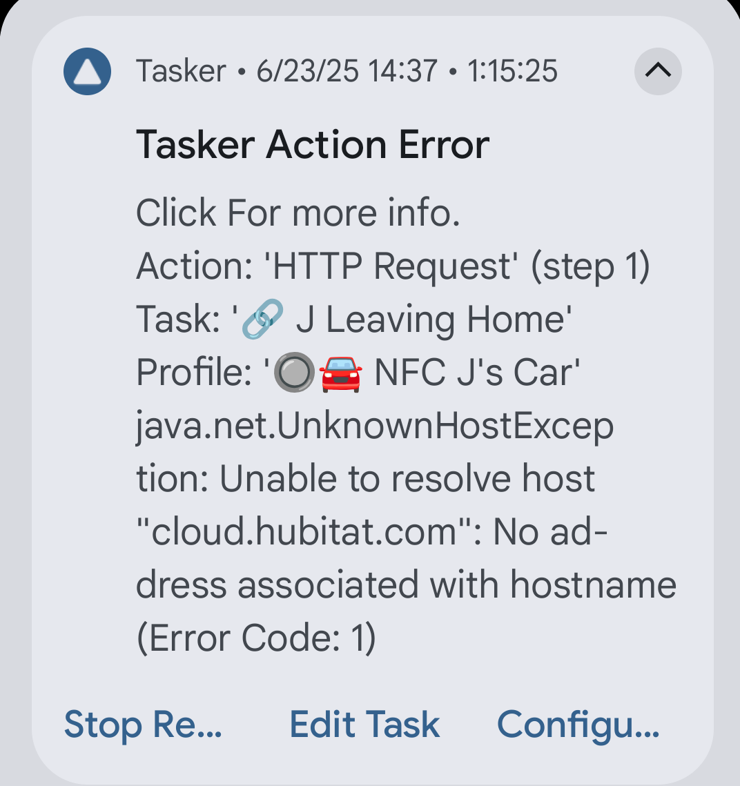 I want to say that I just started having this same problem. It used to be intermittent, but now it is consistent. Tasker has no problem issuing an HTTP request over local Wi-Fi to Hubitat Cloud APIs, but when I'm on the G5 Google Fi network, I get the following error.