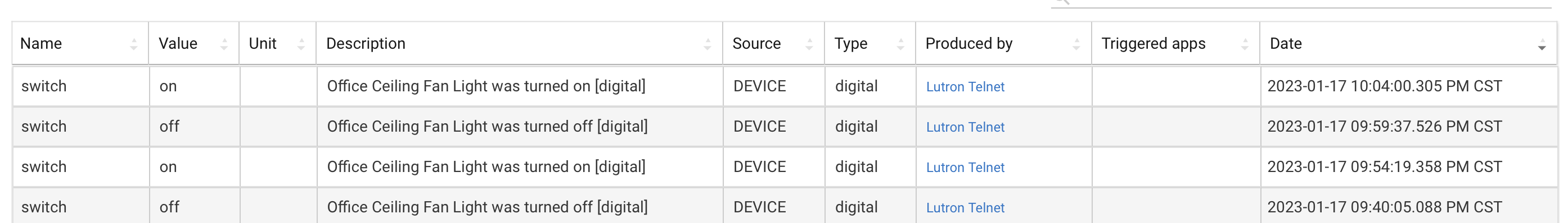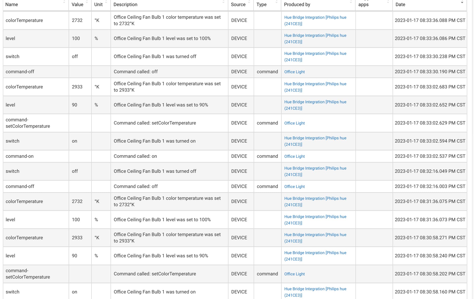 dev:3482023-01-17 08:30:58.160 PMinfoOffice Ceiling Fan Bulb 1 was turned on