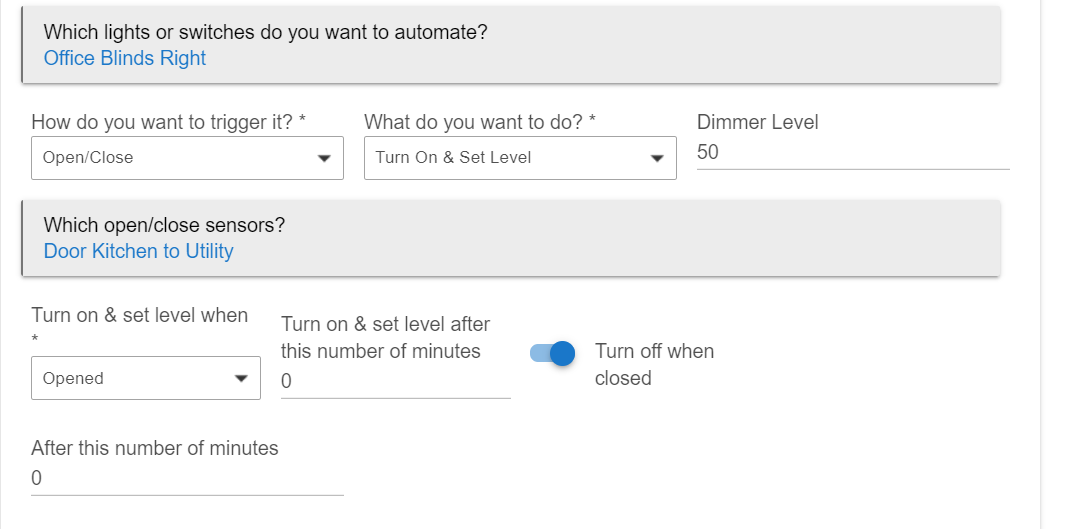 Below is a quick mock-up of a SImple automation rule using set level to control iBlinds...this would open them to 50% level, and the turn off action in the automation will close them.