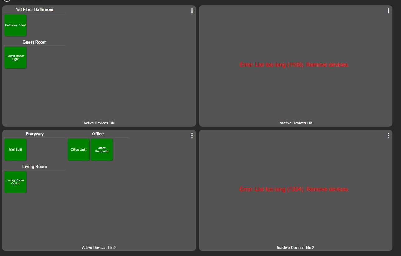 The issue you are running into with the 1024-character limit is because you are trying to shove all that HTML into a single device attribute (Text Tile). My app bypasses that limitation entirely by serving its own dedicated, mobile-friendly HTML Dashboard directly from the hub. It doesn't rely on standard dashboard tiles, so you can display hundreds of devices without ever hitting a character limit.