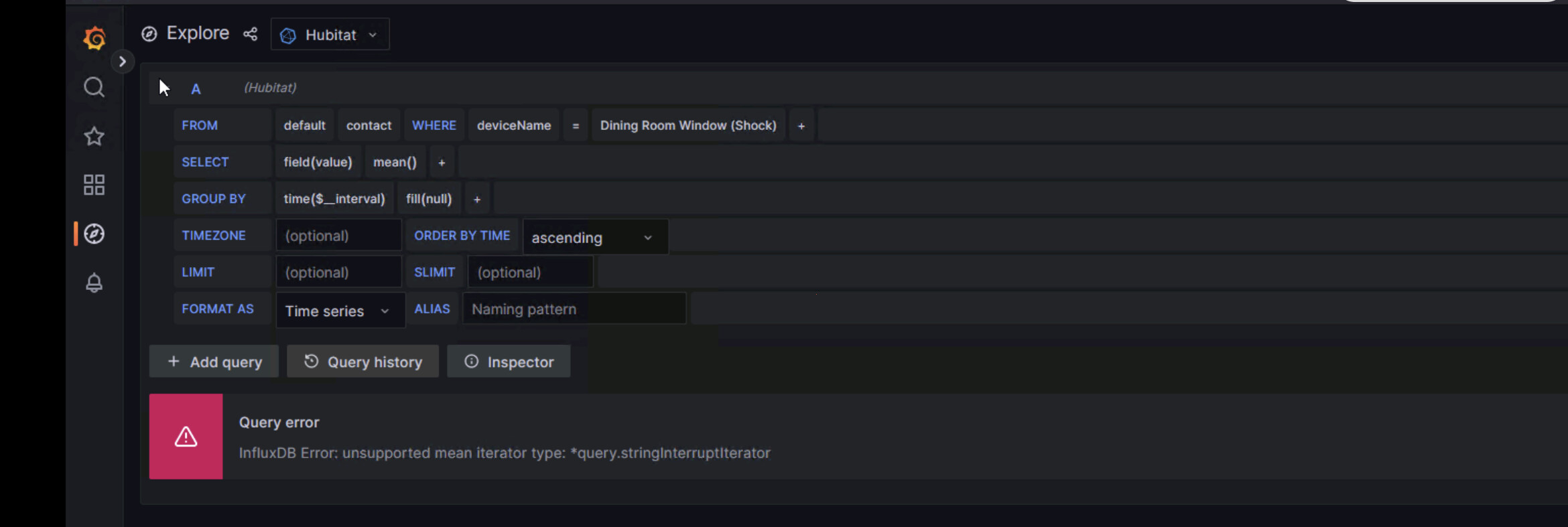 Internal server error" error="[plugin.downstreamError] failed to query data: InfluxDB returned error status: 400 Bad Request"