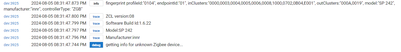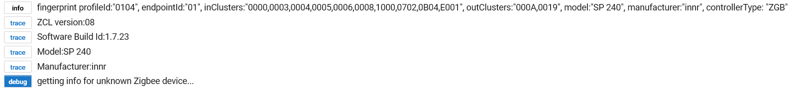 That's strange... Your plug is an SP 244 (v1; there is a v2 with a small hardware change, not yet on the market). The "Image Type ID" (OTA cluster attribute) of the SP 244 (v1) is 0333. The upgrade file that I sent to @mike.maxwell is app_innr-sp244-1.7.23_UG.ota, which has a header (first X bytes) containing the manufacturer ID (1166=Innr), Image Type (0333=SP 244) and the new OTA File Version (another OTA cluster attribute, hexadecimal value 0x17173685). That is consistent with the imageFileName you saw @PunchCardPgmr : 1166-0333-17173685.