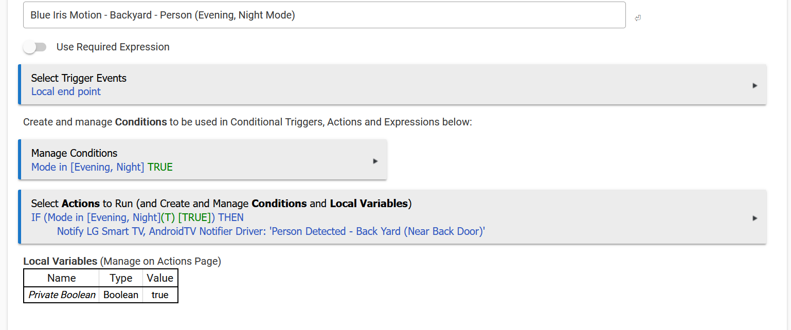 I saw BI Control - Local Blue Iris control when I was looking around and I did install it. For now I just need to trigger some (virtual) motion sensors in HE. I don't use any HE modes since I really don't need them. I don't have any cameras inside the house. The motion detectors I do have inside are used to trigger lights when someone walks into a room. The lights stay on since the sensor is constantly triggered.
