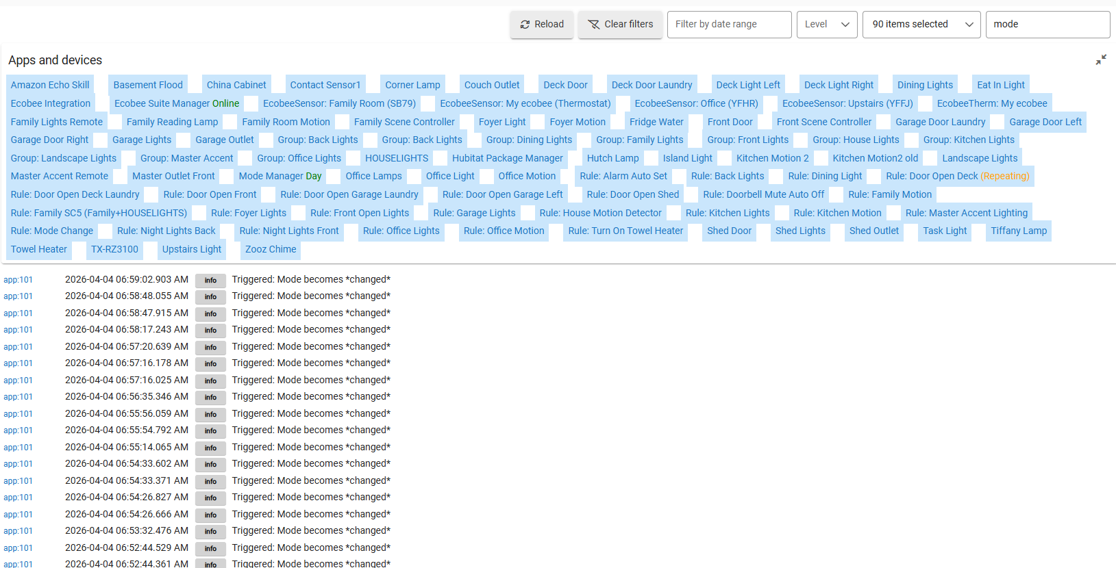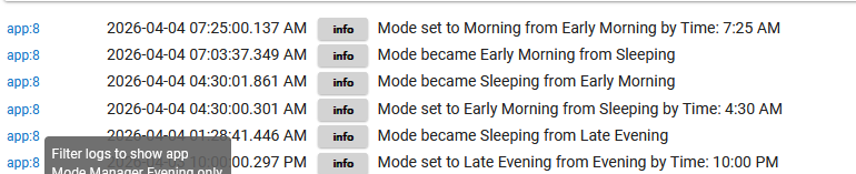 Appreciate the feedback. Yes, searching for mode does yield some results, but I do not see anywhere when mode is changed and what triggered it. I only see apps that affected by a mode change. In your logs, what is app:8? I have nothing in my logs similar. Mine are all just the apps that are triggered.