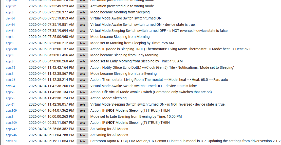 That’s great to know. I still cannot see what triggered the change there. I’ve determined that my one trigger for day mode that is based on illuminance of two outdoor sensors (front and back of house) were fighting each other based on this oscillation between day and night as the sun rose. The triggers are OR’d and there is no option to AND them. I now only rely on one and added report logging in my mode change app. More standard logging should be available from the integrated mode manager.