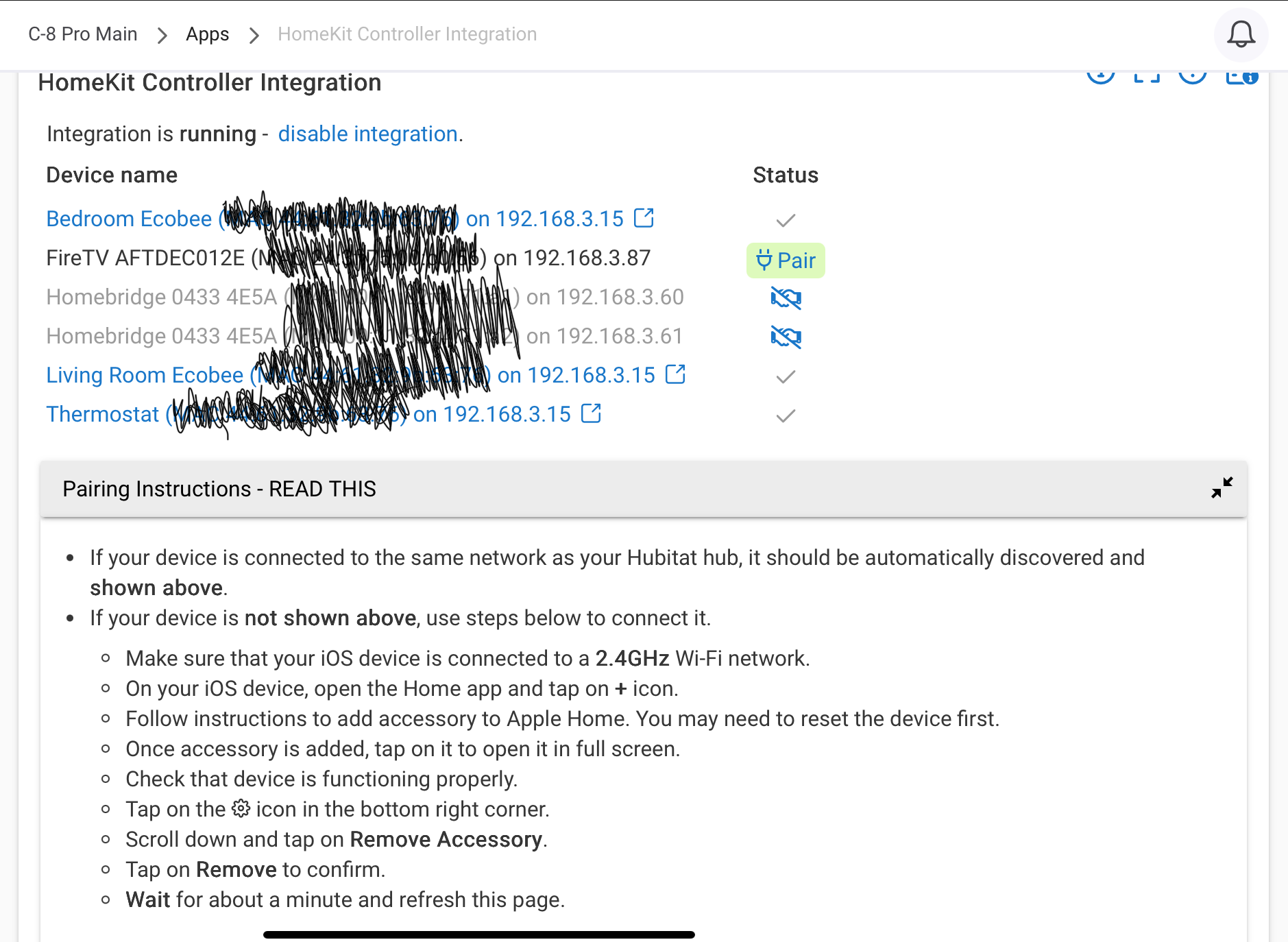 If you select "Yes" Hubitat will prompt for pairing code again? Well the Ecobee thinks it paired successfully with the Hubitat, the Hubitat says it's already paired with another device. The only way to get a pairing code again is in the Ecobee settings and removing the HomeKit paring. And do another start paring again on the Ecobee which generates a new code and that code doesn't work when enter into the Hubitat. And the process has to start all over again.