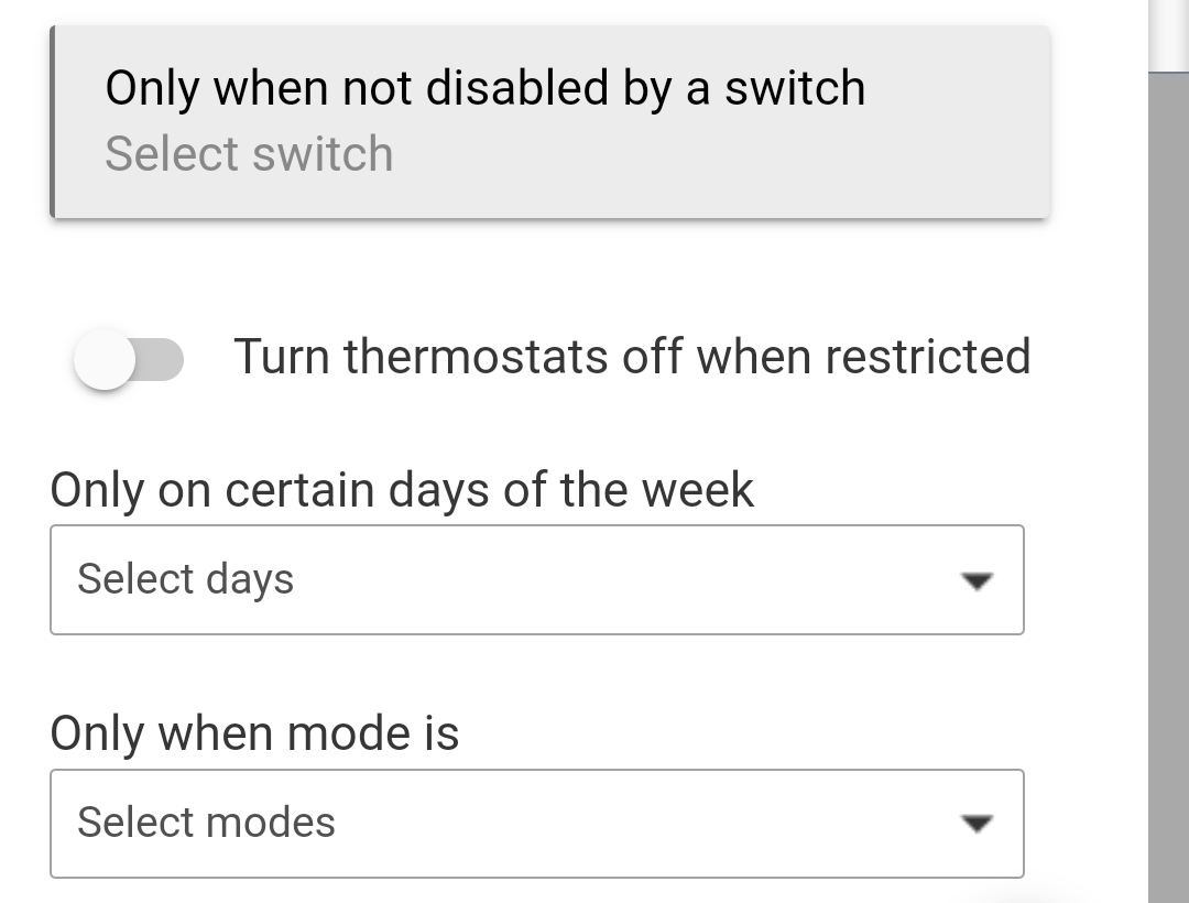 Why - reasonable question. Ultimately, I am trying to figure out the best effiency between my gas furnace and my minisplits. New England weather is quite variably. The controllers are all zwave and I have been using them with homeseer where I had a bunch of rules set up. I could click a button to turn a rule on or off. Practically my minisplits run all the time unless I set the heat/cool mode to off. I know they do not use a lot of electricity when they are on and idle, but they do use some. Turning them off reduces that. Psychologically, I come from a manual control of the thermostat generation and the idea of the heat on when it is in the high 50s out, freaks the dad in me out a bit. I am trying Grizzle's suggestion for rules.