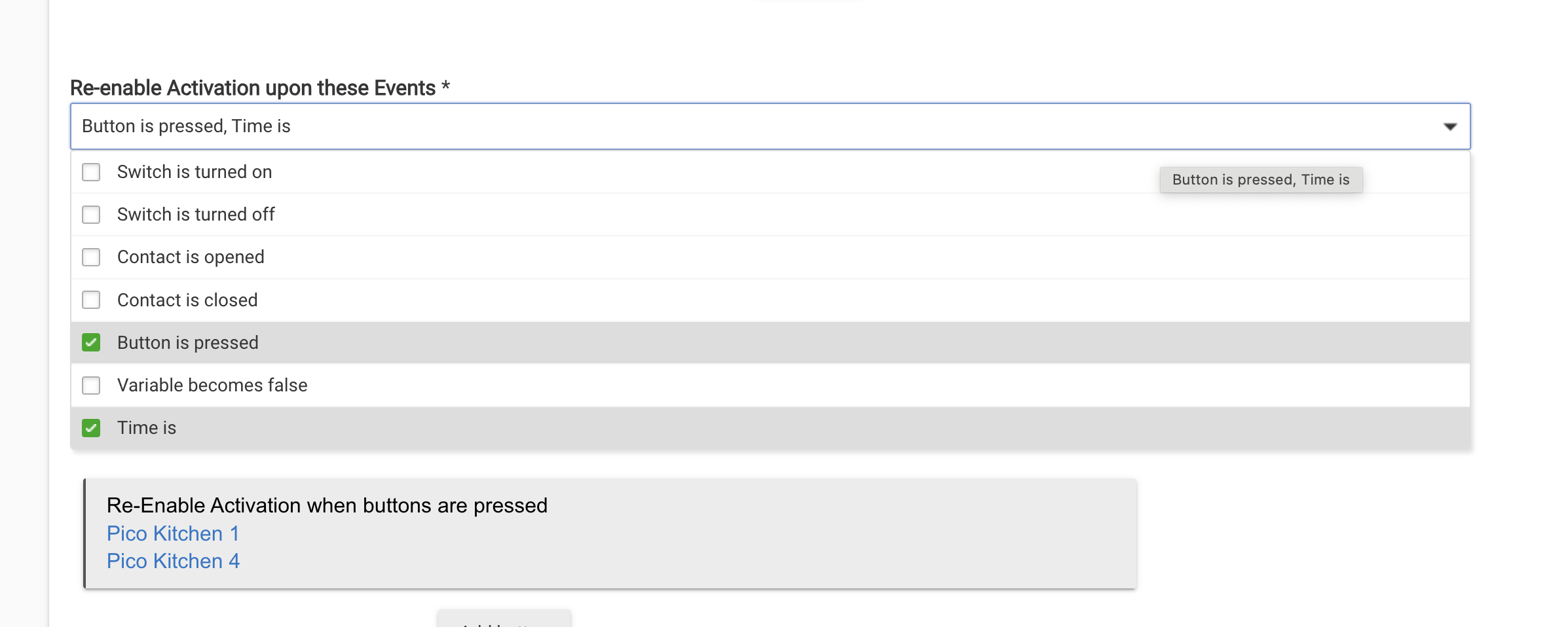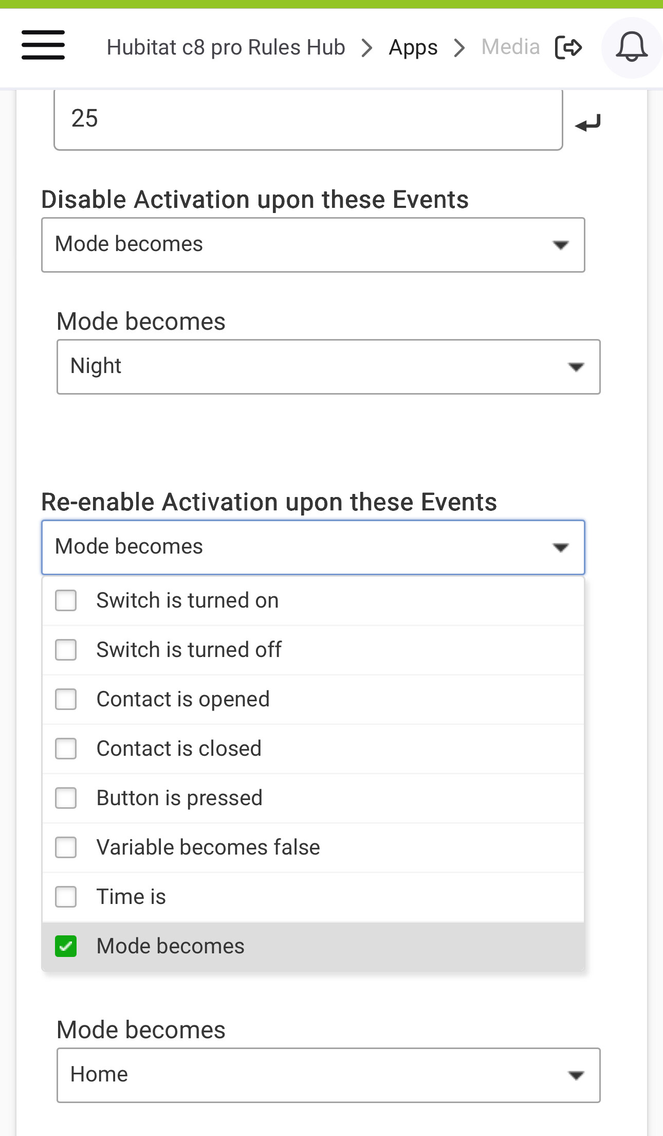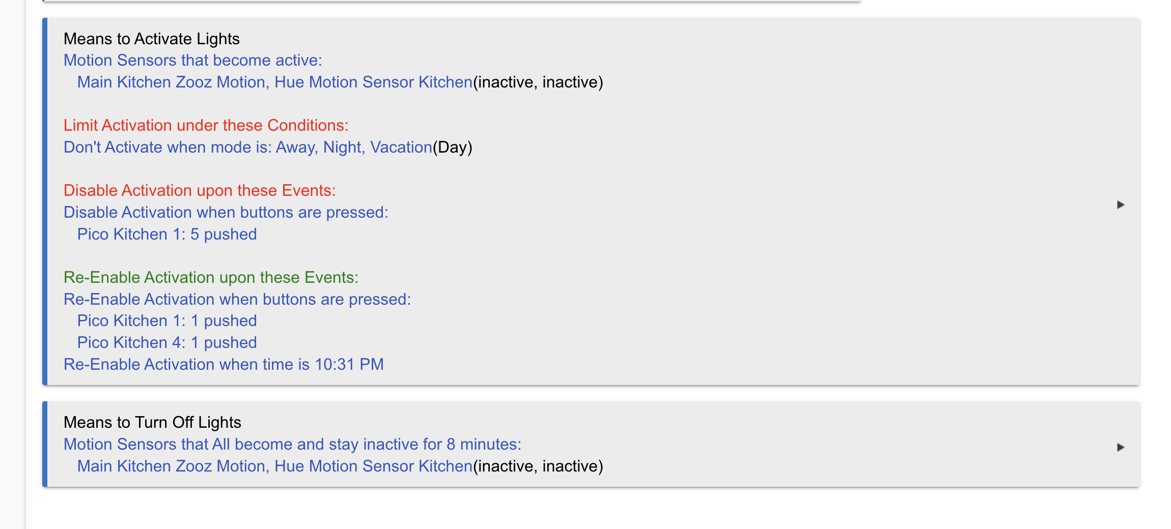 I use motion sensors in Room Lighting to activate light switches. I want this disabled at night so the dog doesn't activate the lights all night long. I have the app to limit activation when the mode is Night. I also have a Pico that can disable the motion earlier than when the mode changes to night (if we go to bed early). Is there a way to re-enable activation based on the mode going back to day? I have to use the Pico to re-enable activation in the morning if I disabled it at night with the Pico.