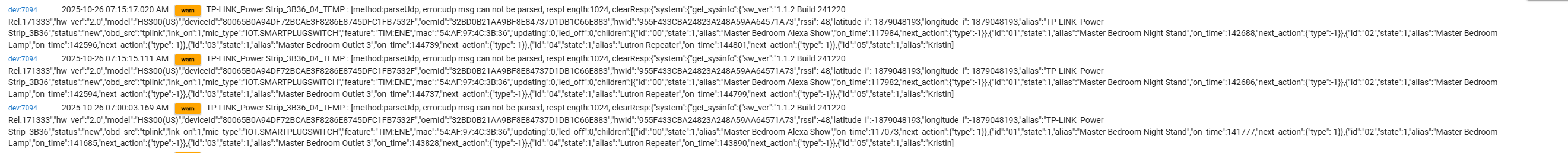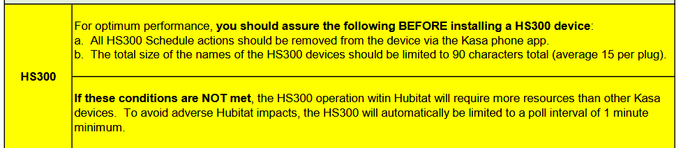 See the below. Names are way too long. (For the HS300 there is a work-around since the Hubitat UDP implementation does will only pass the 1024 characters to the requesting method). This note got dropped sometime several years ago. I will fix the documentation. I suggest shortening the name of the power strip as well as the six outlets using the Tapo/Kasa App.