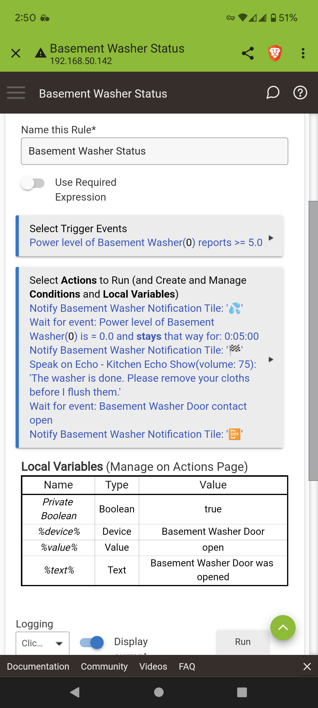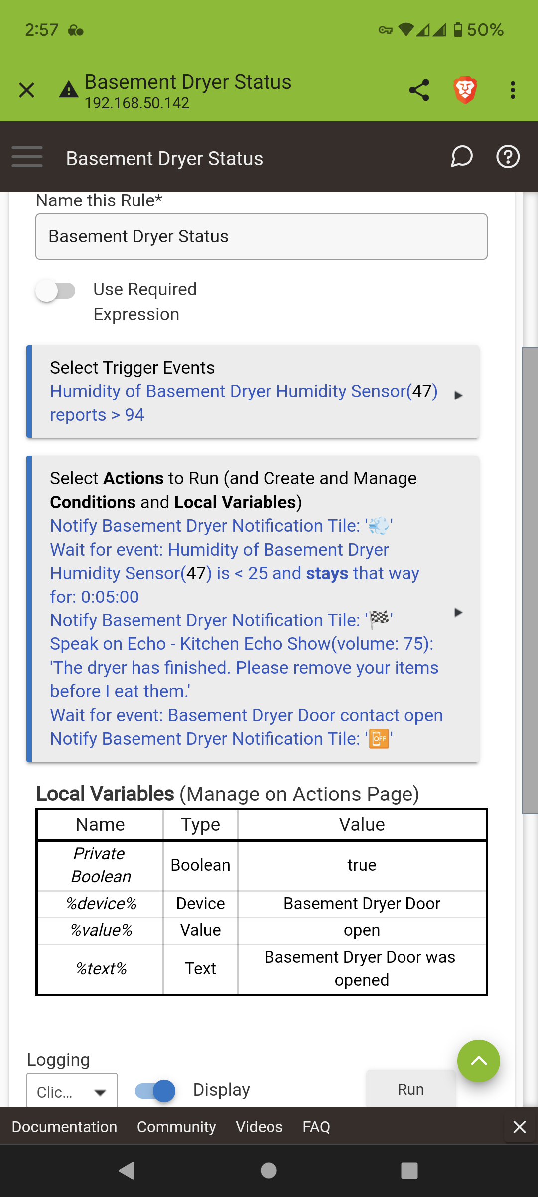 The Dryer: Here I used a Sonoff temp/Humidity sensor and slapped it right on the inside of the door with the wet hot cloths (Don't do this, put it in the dryer vent so it's cooler). I will say it is still working after dozens of loads, though I admit the temp portion doesn't report anymore. Than we need that mobile presence tile for notifications and another contact sensor. Here's the pic of the rule.