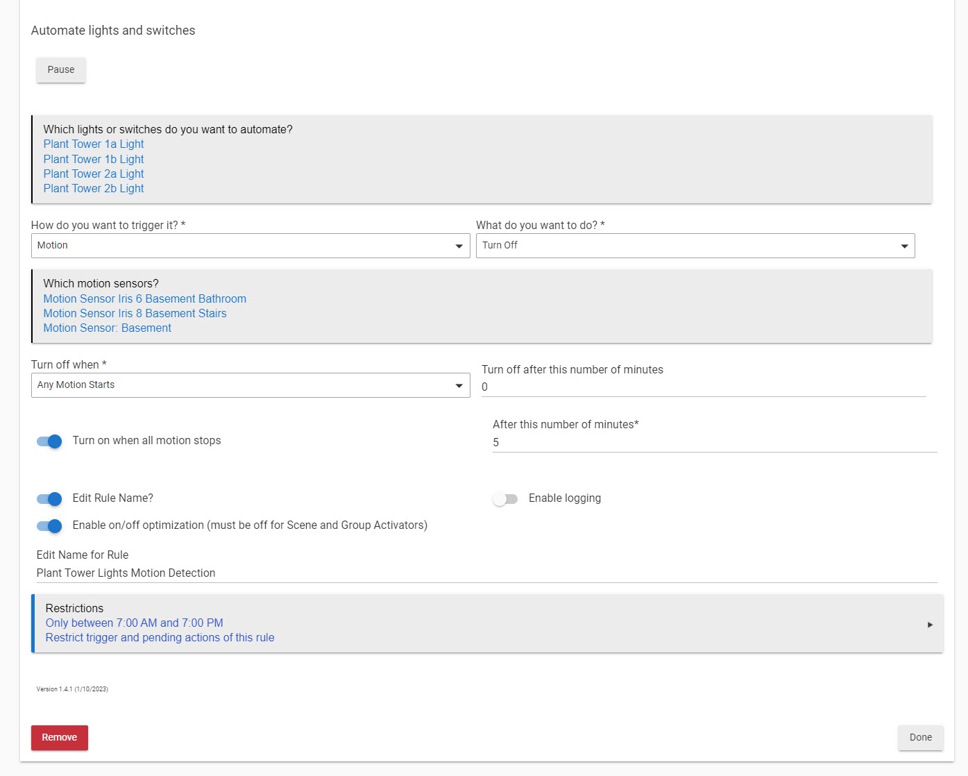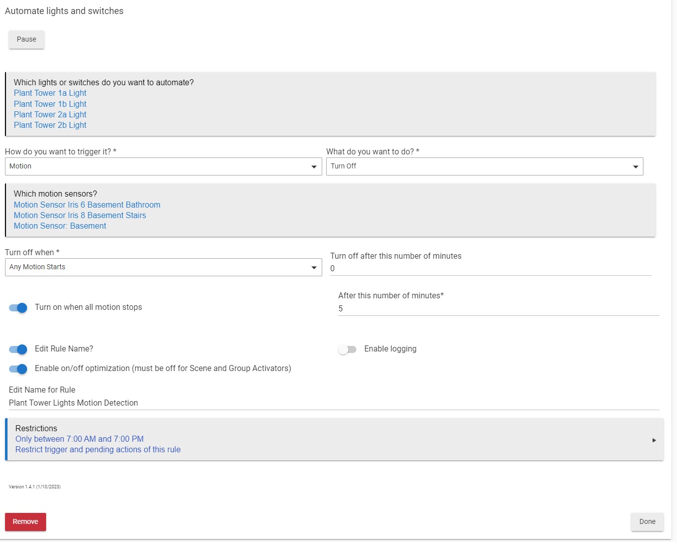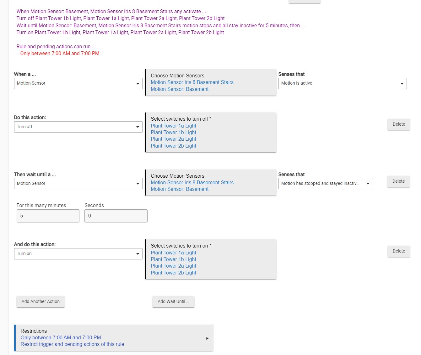 So I need the plant lights to turn off whenever there is motion detected/activated and remain off for let's say 5 minutes until motion is no longer detected then turn back on when the "coast is clear." The lights need to be running between 7 am and 7 pm but not blasting people in the face when they enter this area.