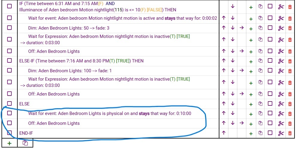 I do not use mode or required expressions. My rules work except for the part, if the light switches are physically turned on. The way I've been working around it is by setting an additional else-if statement with the trigger times included like the ones above it so the full 24 hours schedule is accounted for in the rule. But if I use the ELSE (to account for triggers outside the specified time) then the rule doesn't work. What am I missing in order to fix that. I'm going to test if changing it from physical switch to just switch will fix this issue. How can I make it work without breaking the rule into two?