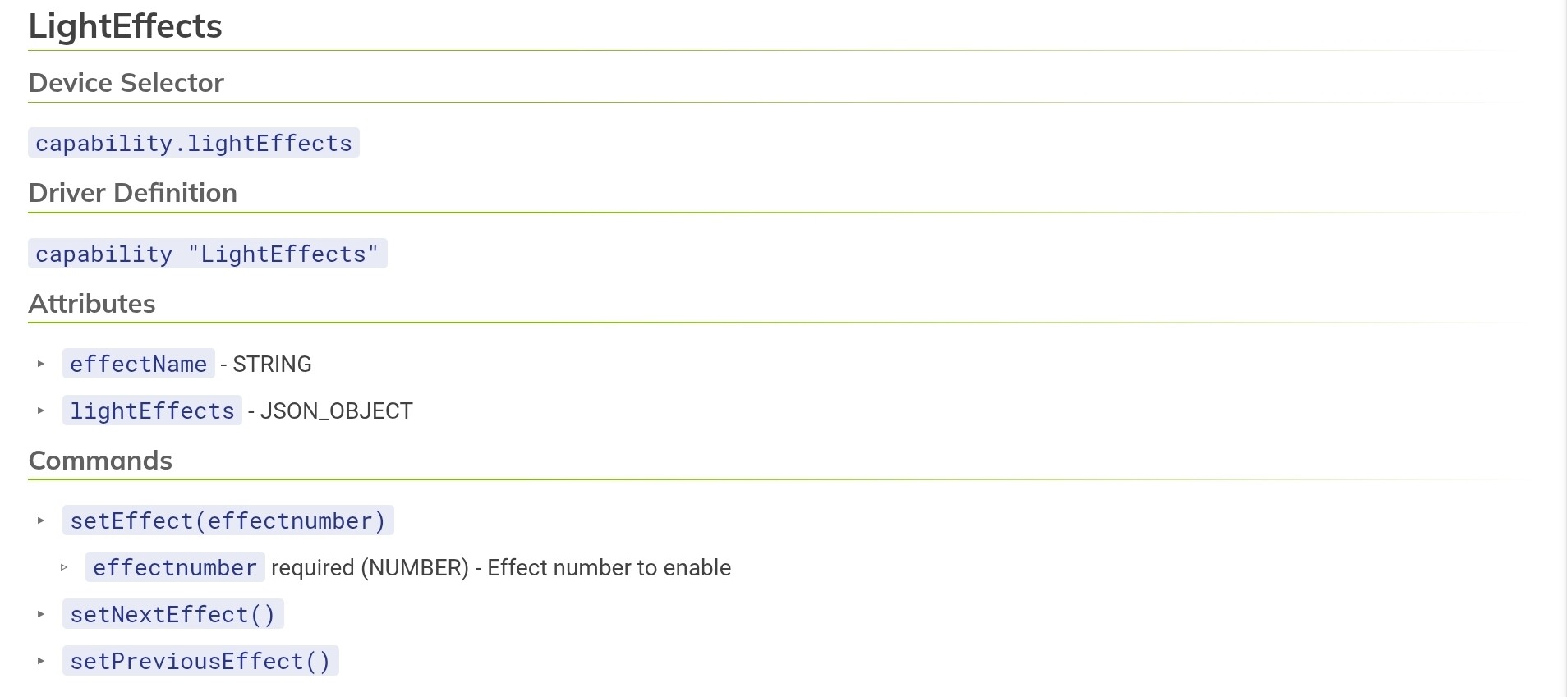 Thanks, It would be awesome if we can get more devices to have a valid json for the lightEffect attribute. This could mean my new app could interact with all of those devices to automate light effects across multiple brands of devices. Right now that can be kind of tedious