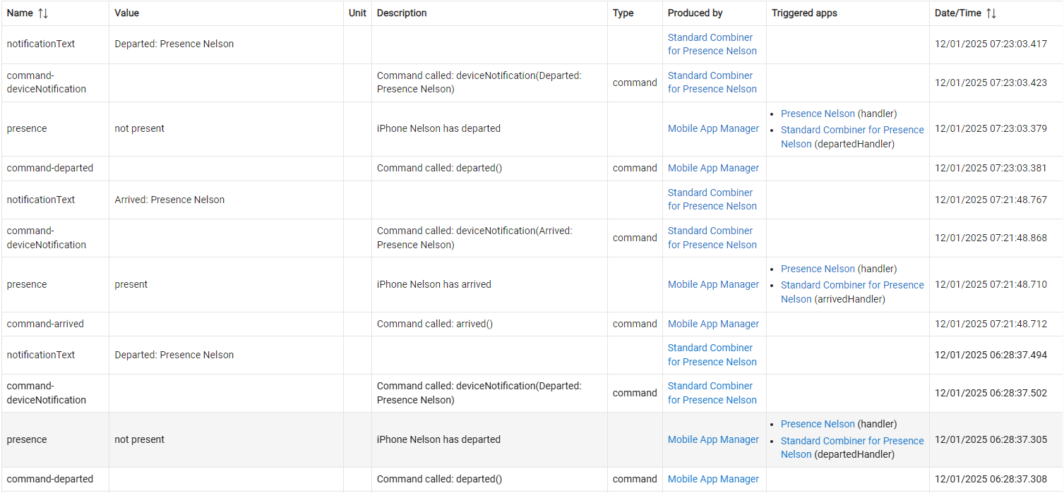 Here is a screenshot of all of this morning events since I departed for real until I opened the app and then sent geofence event again. This was with "use Hubs WiFi for presence enabled", could the message of what exactly triggered the presence (WiFi or GPS) be in the logs just to aid in debuging?