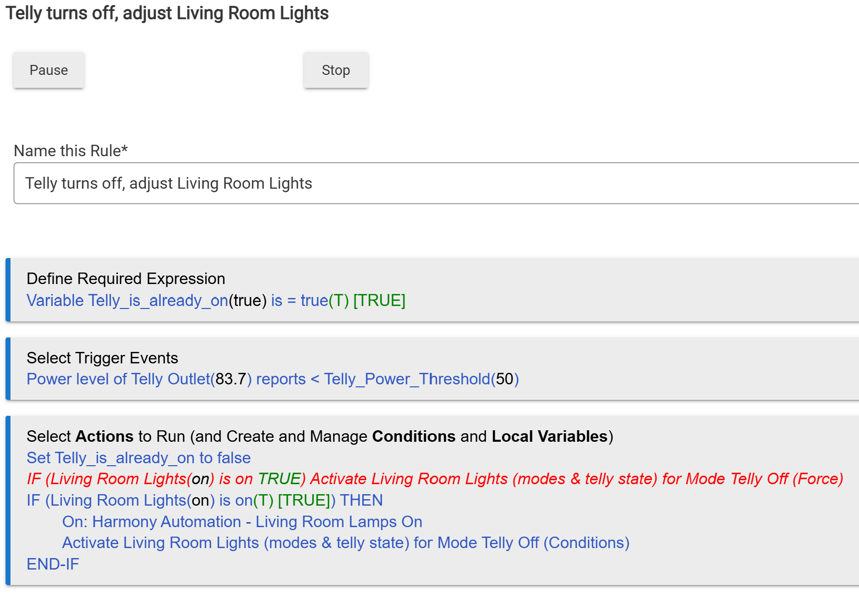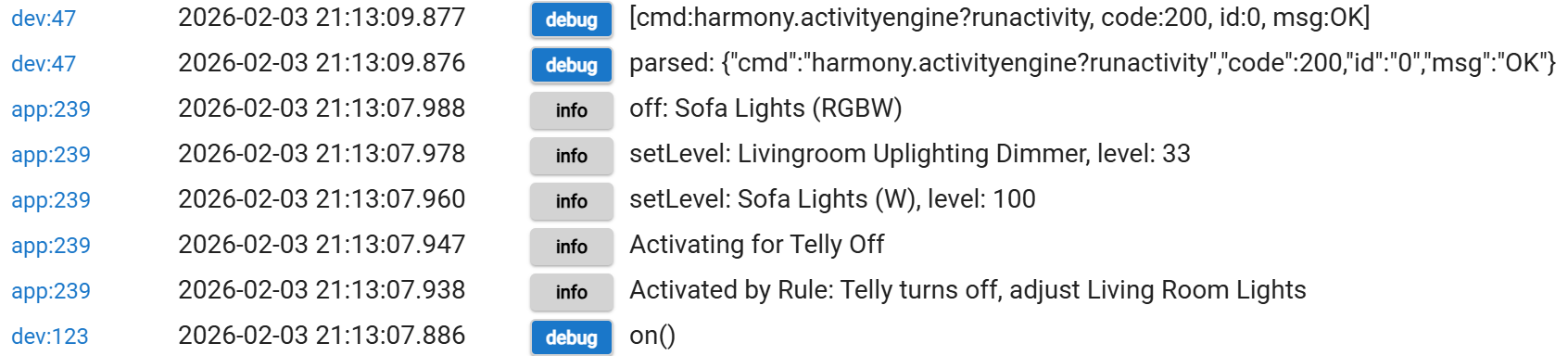 I turn on the TV and the Rule Machine detects it and issues the command to change the Room Lighting. The same rule is supposed to tell the Harmony to turn off the Cree bulbs but they don't turn off. I can then run the rule actions through the web interface (or through another rule that issues the same commands) and the bulbs will then turn off as requested.