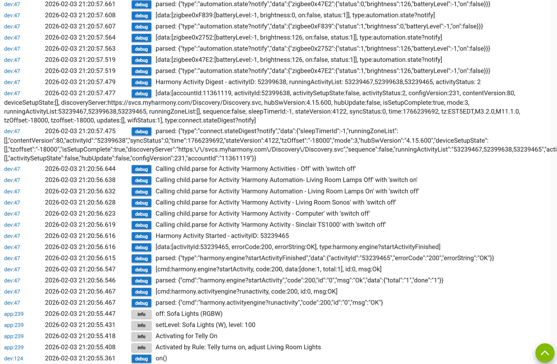 Logs in timeline order for when I enter the room and the rules run. You can see what is being done. I don't pretend to understand most of what's going on here...