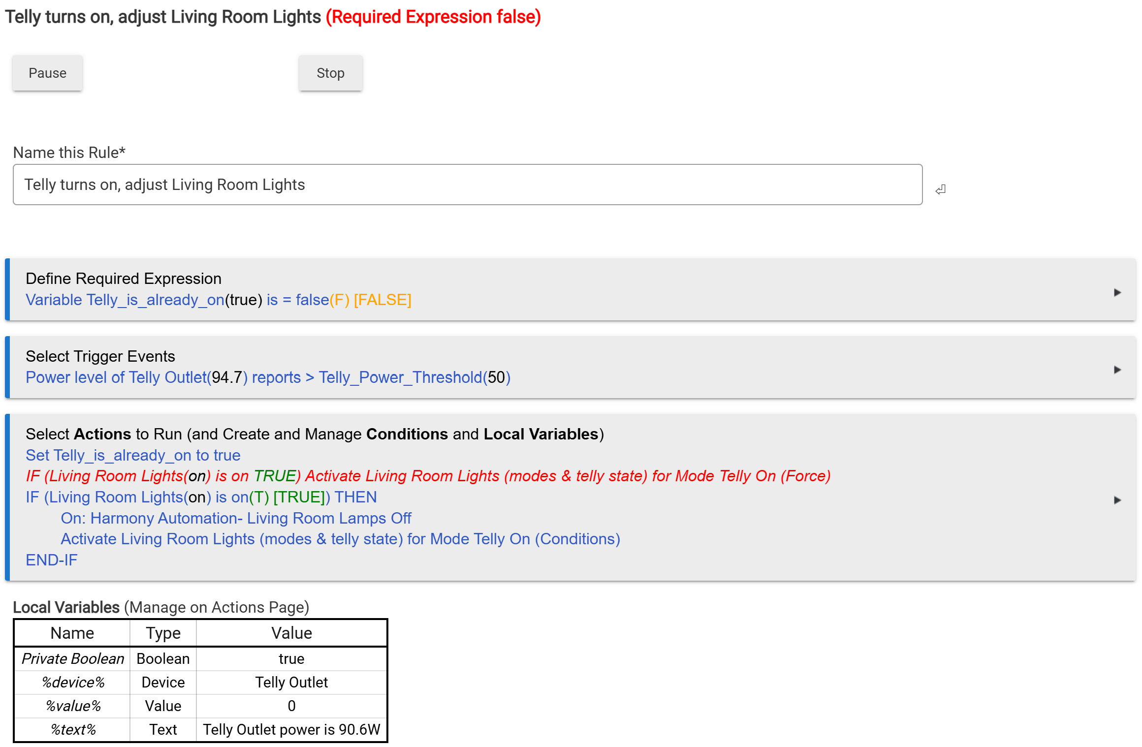The rule that doesn't run correctly when the TV turns on (and that I have to repeat through the web interface)...