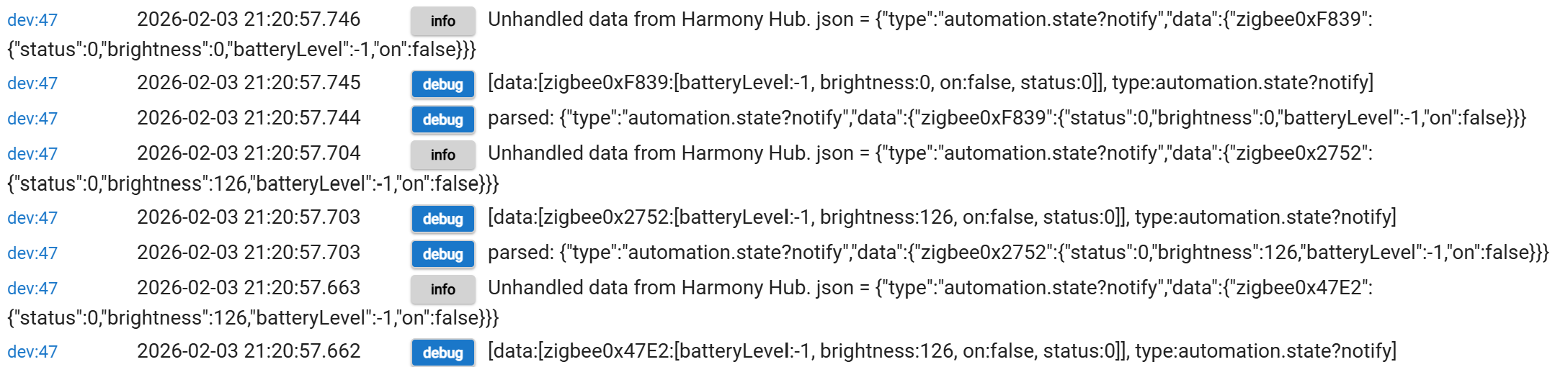 The table lamps are Cree Zigbee bulbs and, knowing that they don't always play nicely with other Zigbee devices, I have them associated with the Extender of my Harmony Hub.